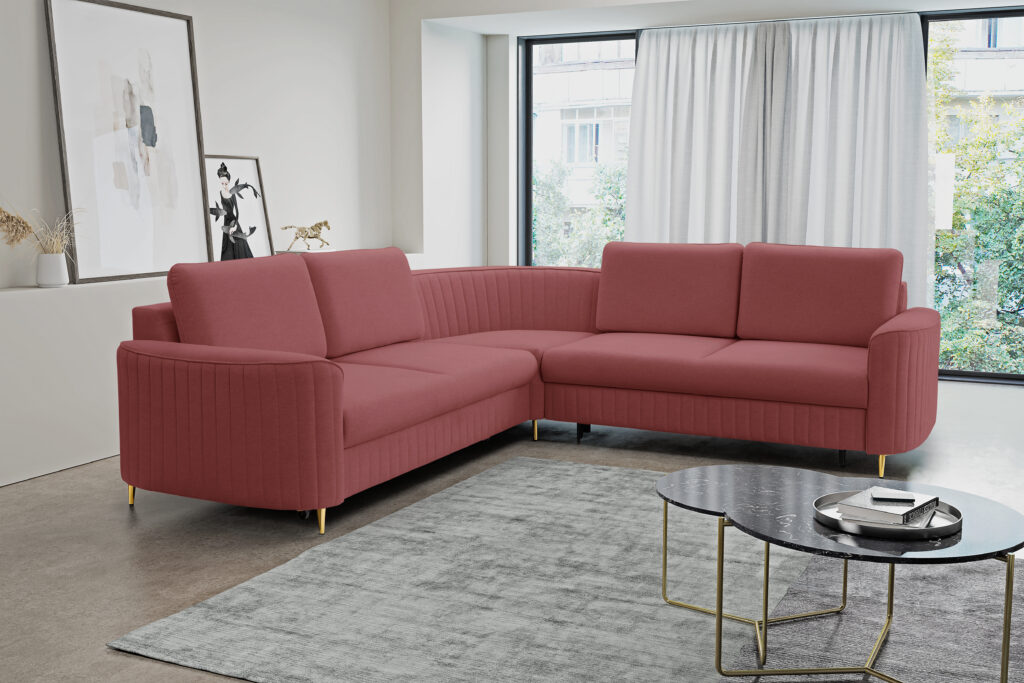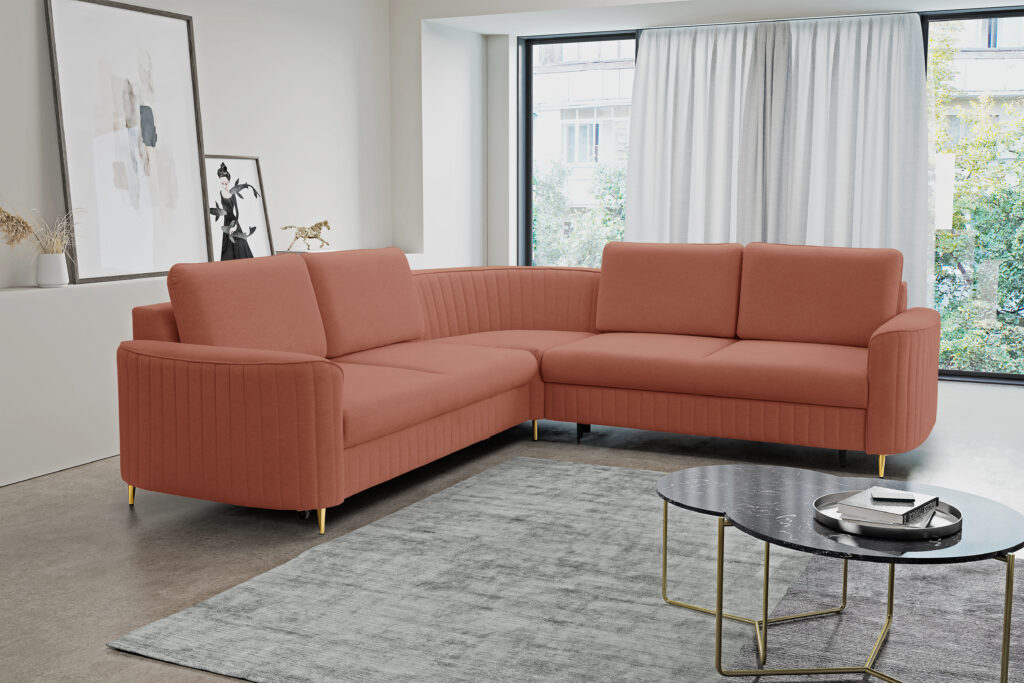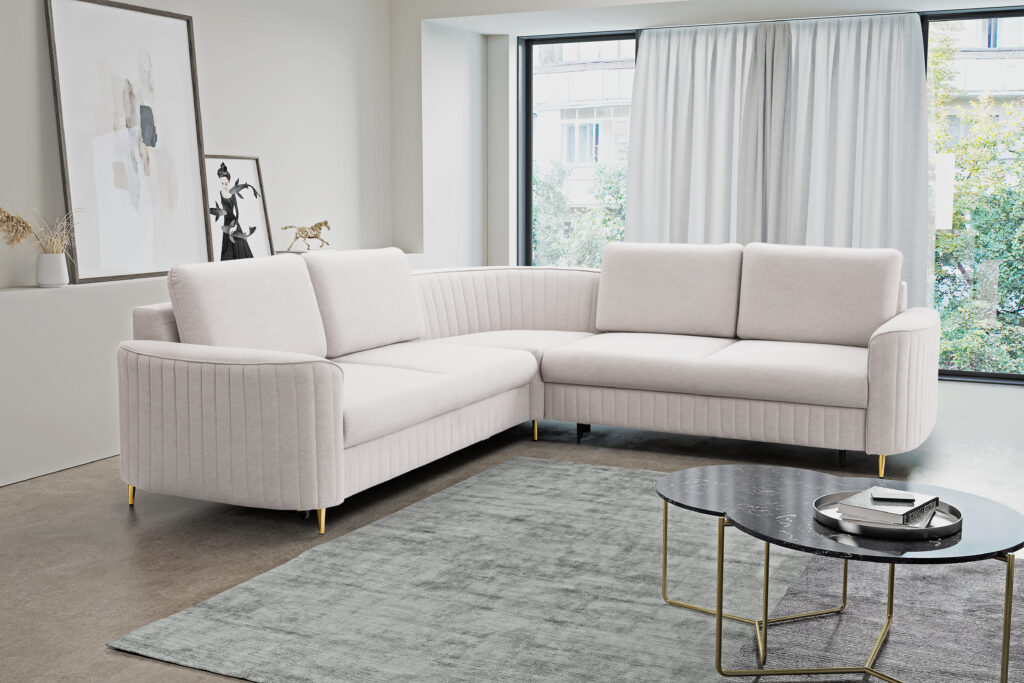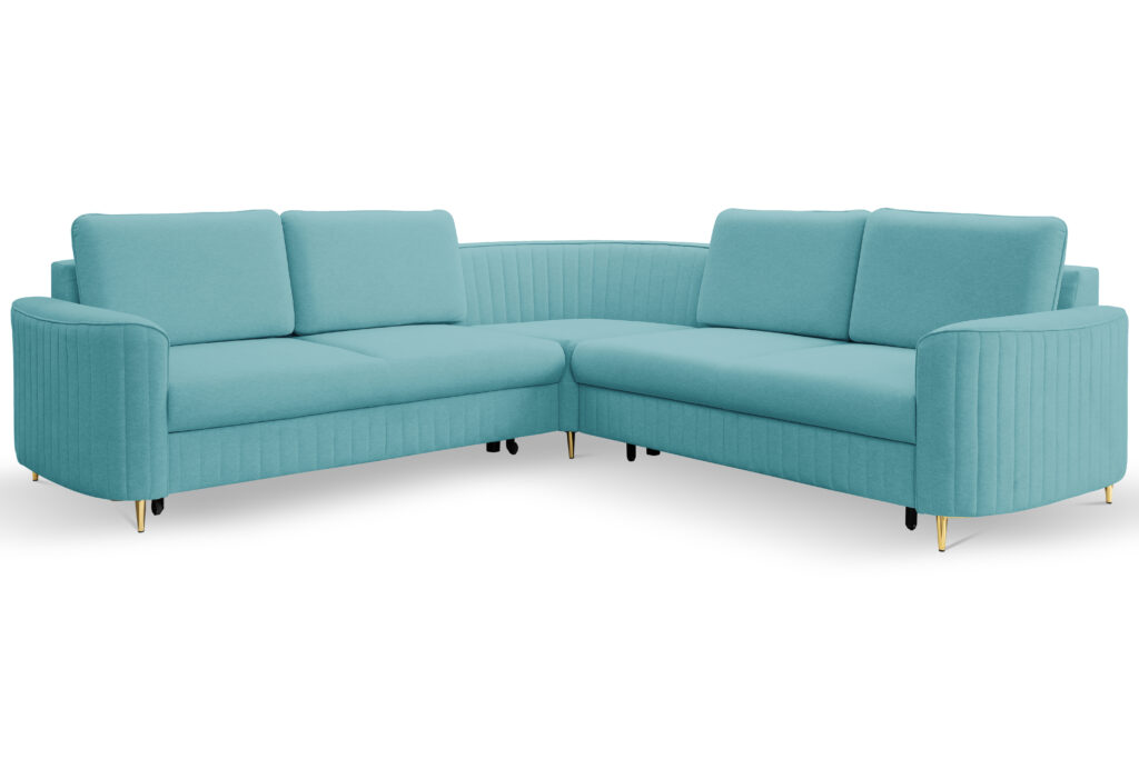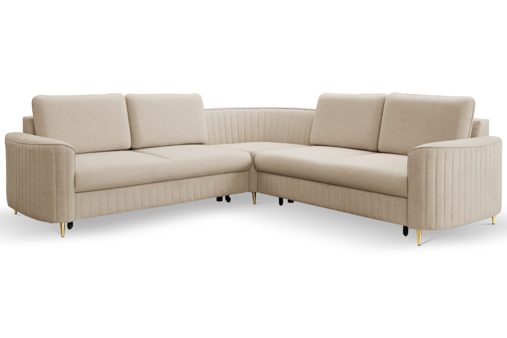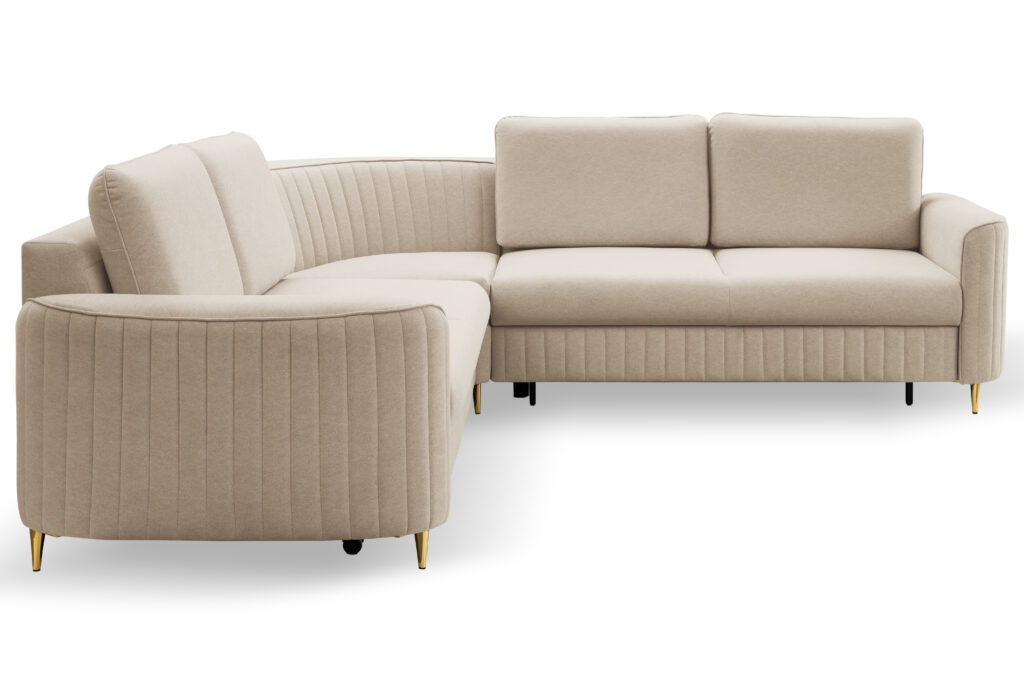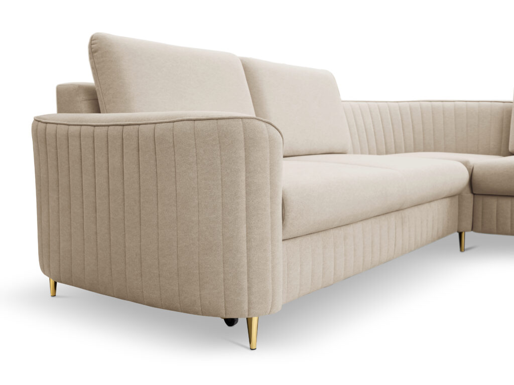 Super wygodny, piękny i nowoczesny narożnik Laren w stylu Glamour z modnymi,ozdobnymi przeszyciami.Elegancja i styl podkreślona metalowymi nóżkami w złotym kolorze.