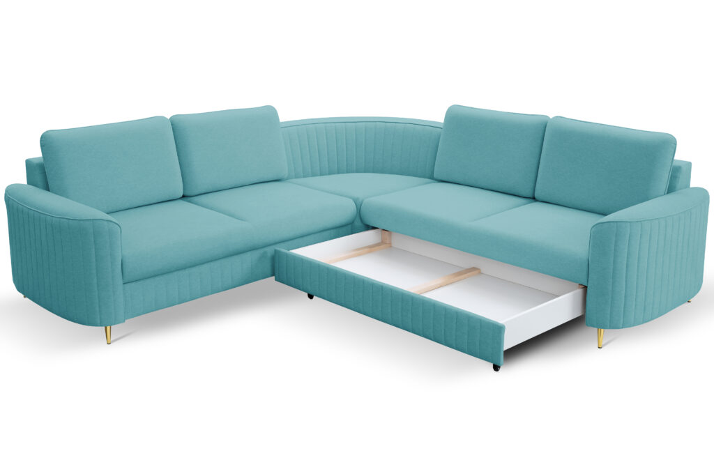 Narożnik posiada funkję spania oraz pojemnik na pościel.