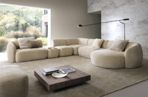 Nowoczesny, duży narożnik modułowy NOBO w obłych modnych kształtach.Zaokrąglone,obłe kształty tej bryły nadają mu nowoczesnego charakteru.