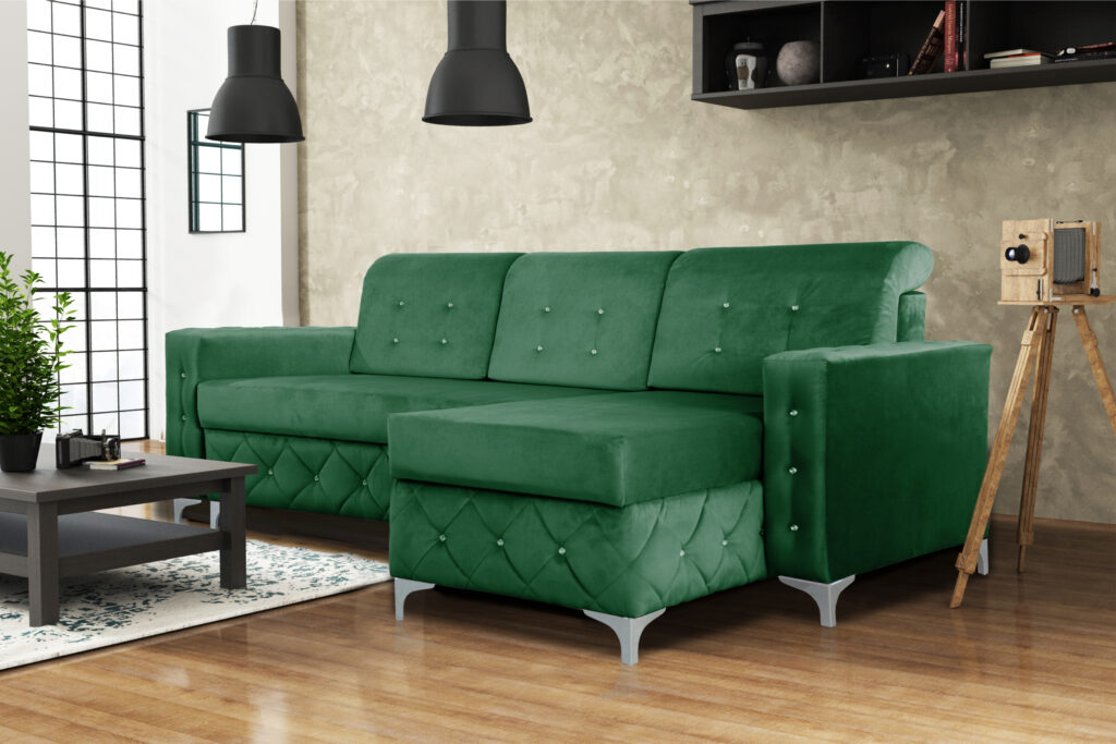 Narożnik Monaco wyróżnia się charakterystycznymi pikowanymi guzikami na dole mebla oraz na frontach boków i poduszkach oparciowych.