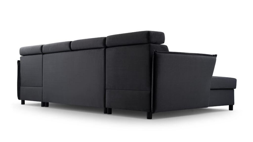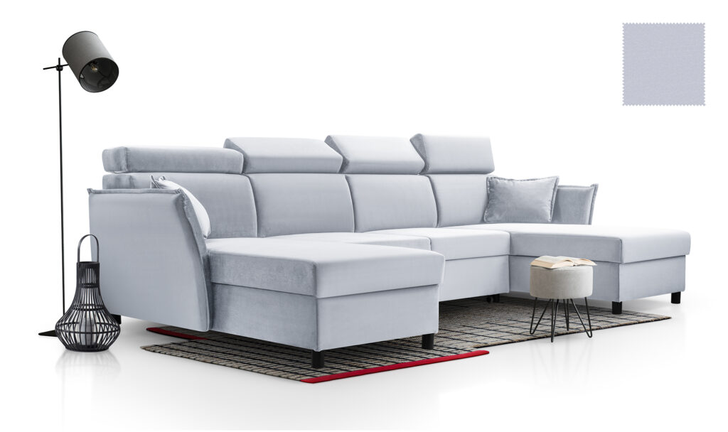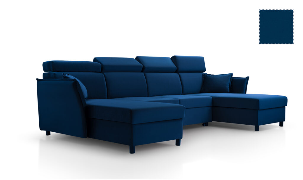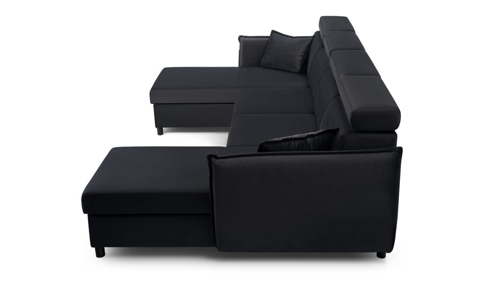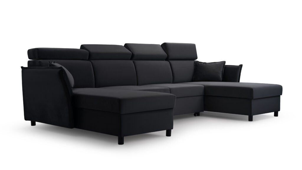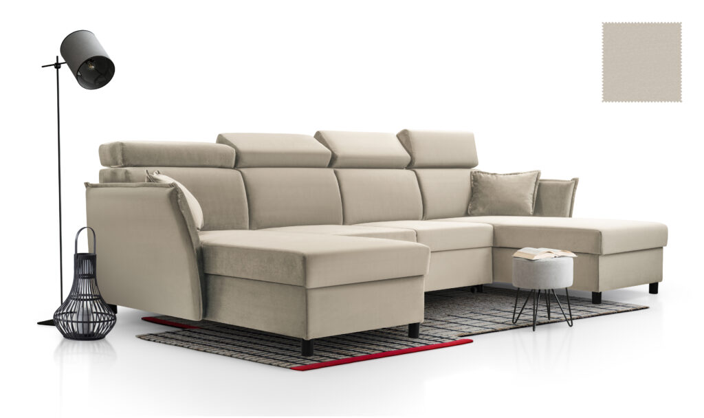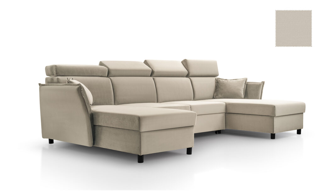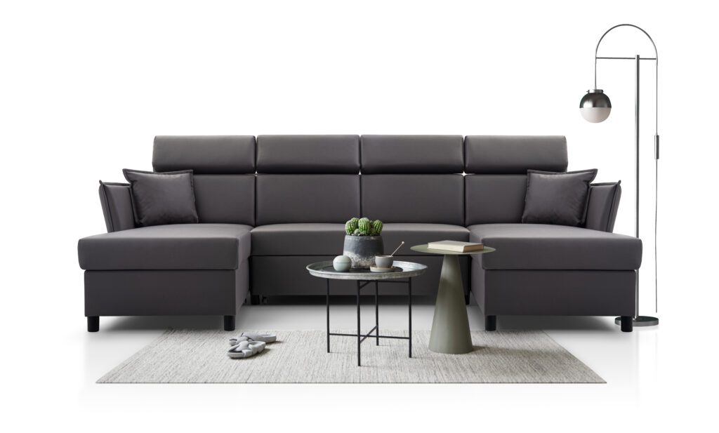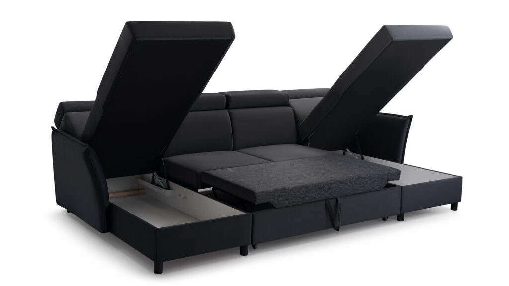 Duży narożnik w podkowie z funkcją spania który posiada 2 pojemniki na pościel z łatwym w obsłudze system DL.