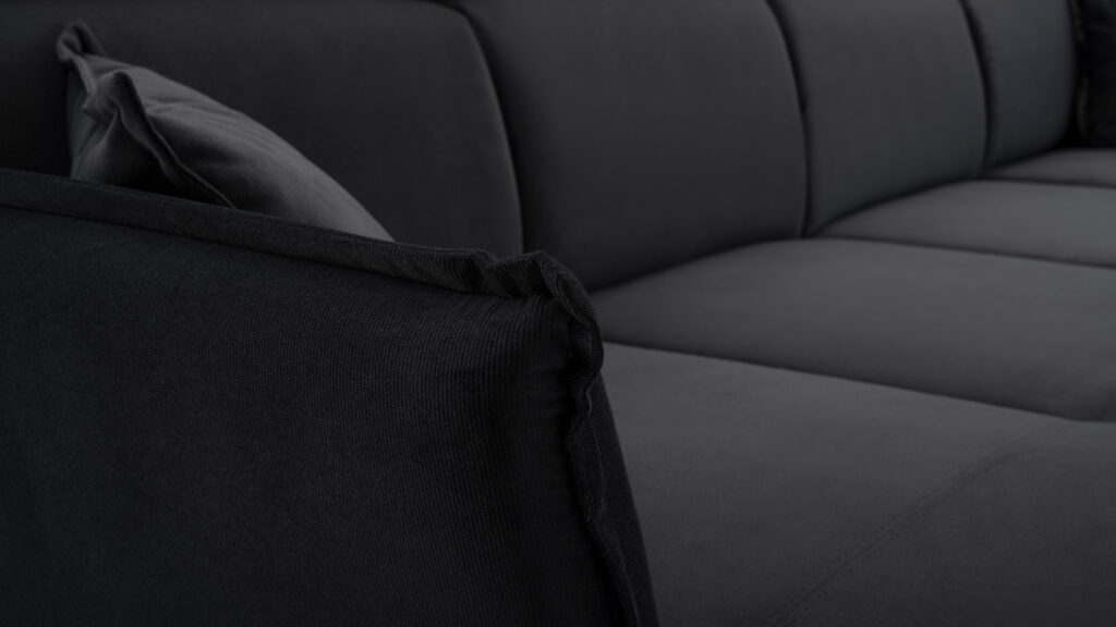 Sofa narożna na zdjęciach wykonana jest z tkaniny Kronos/Paros/Nebu typu aksamit o wysokich parametrach technicznych.