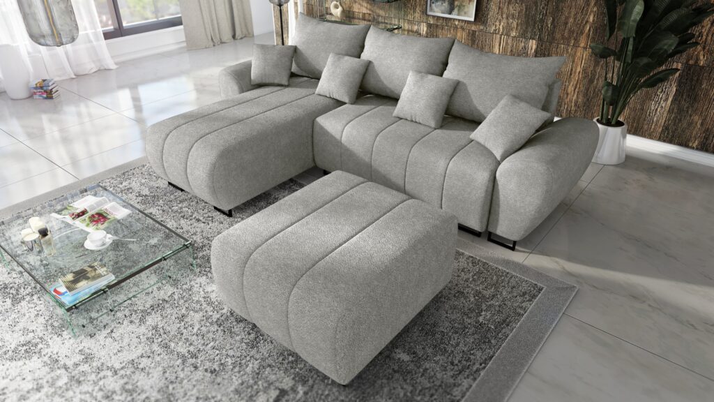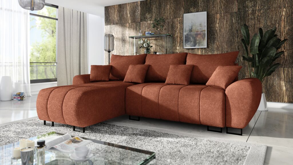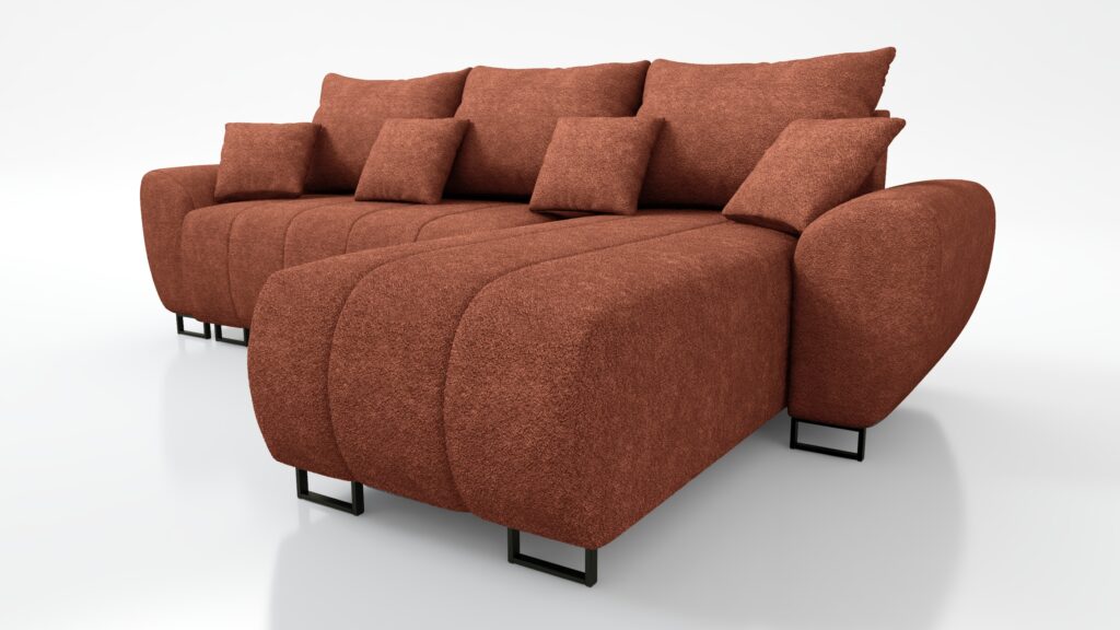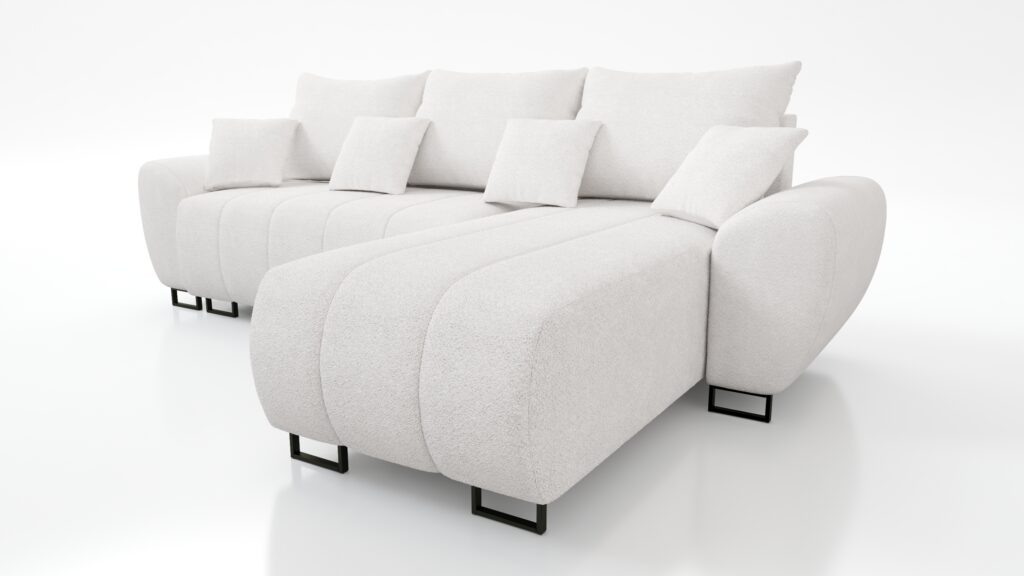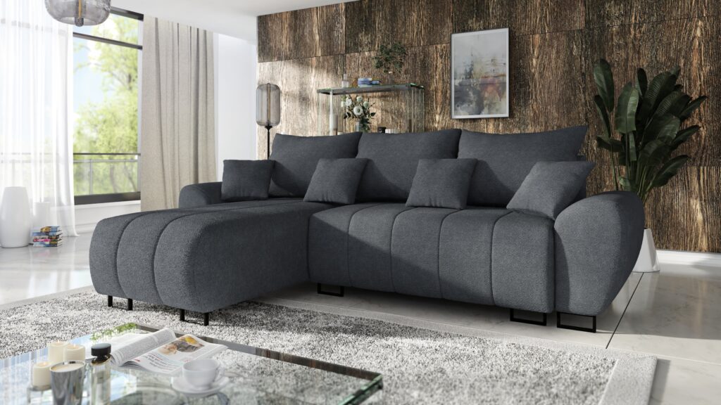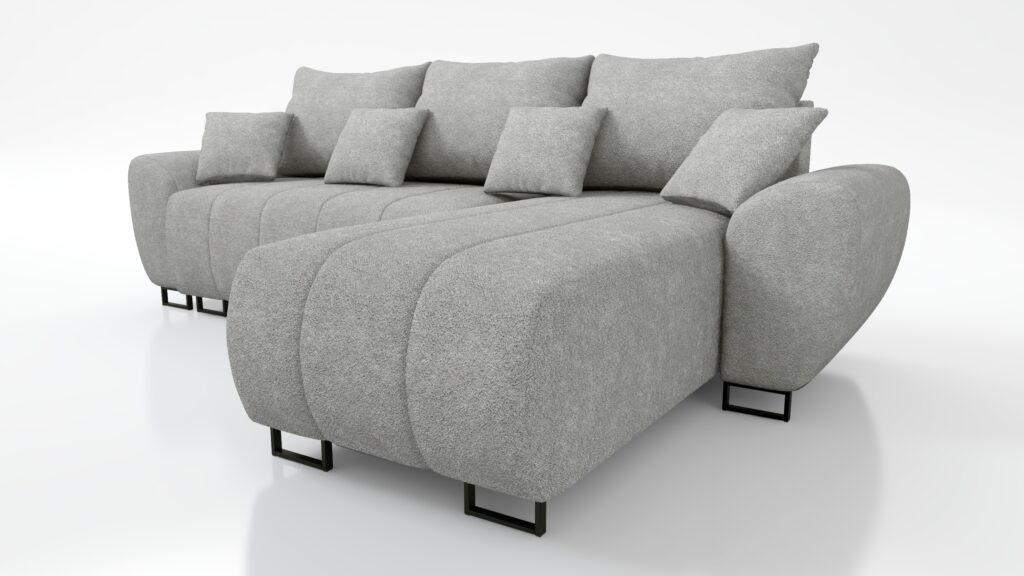 Za komfort siedziska odpowiada pianka wysokoelastyczna PUR T-30. Narożnik został wyposażony w stylowe wypukłe boczki oraz 3 duże poduszki oparciowe i 4 małe jaśki. Z przodu sofy widoczne są czarne metalowe,matowe nóżki .