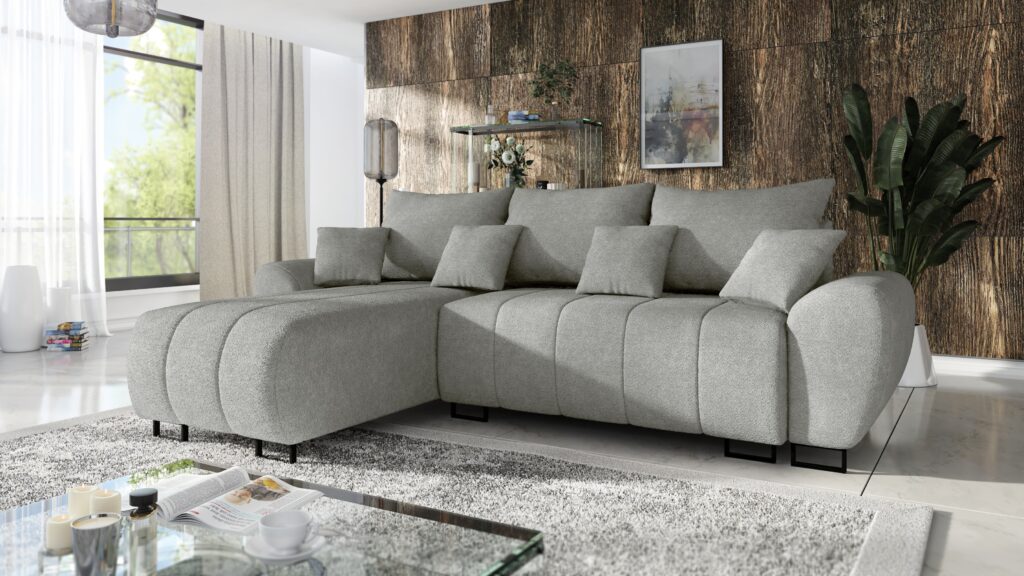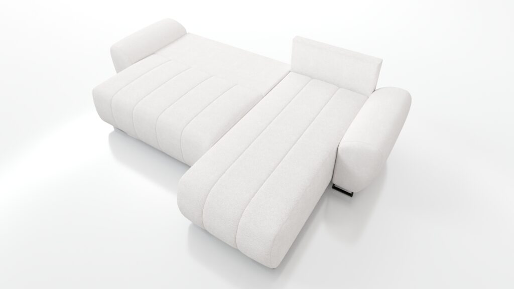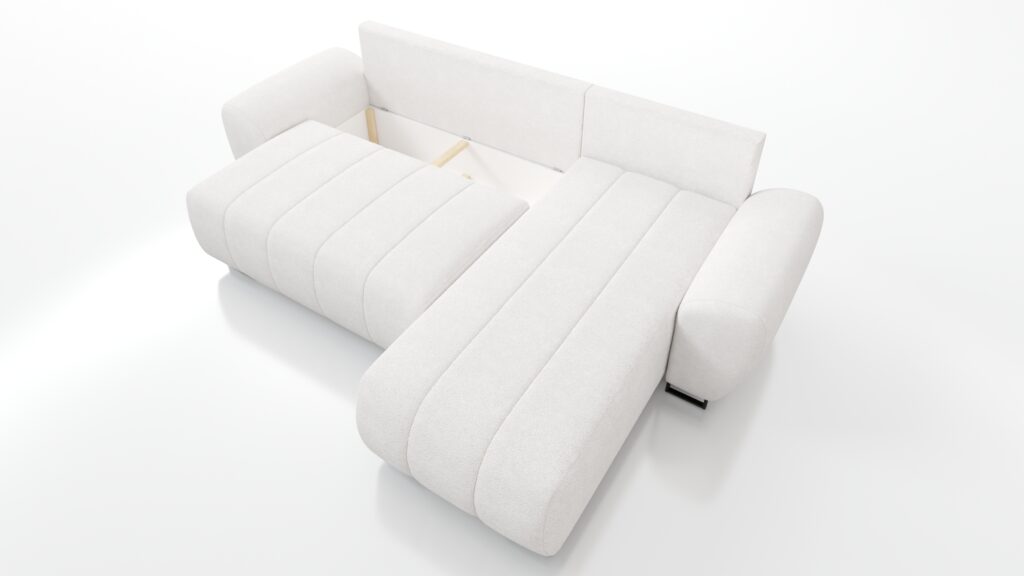 Mebel posiada funkcję spania oraz pojemnik na pościel. Narożnik jest uniwersalny – co oznacza że decydujesz przy montażu o stronie mebla.
