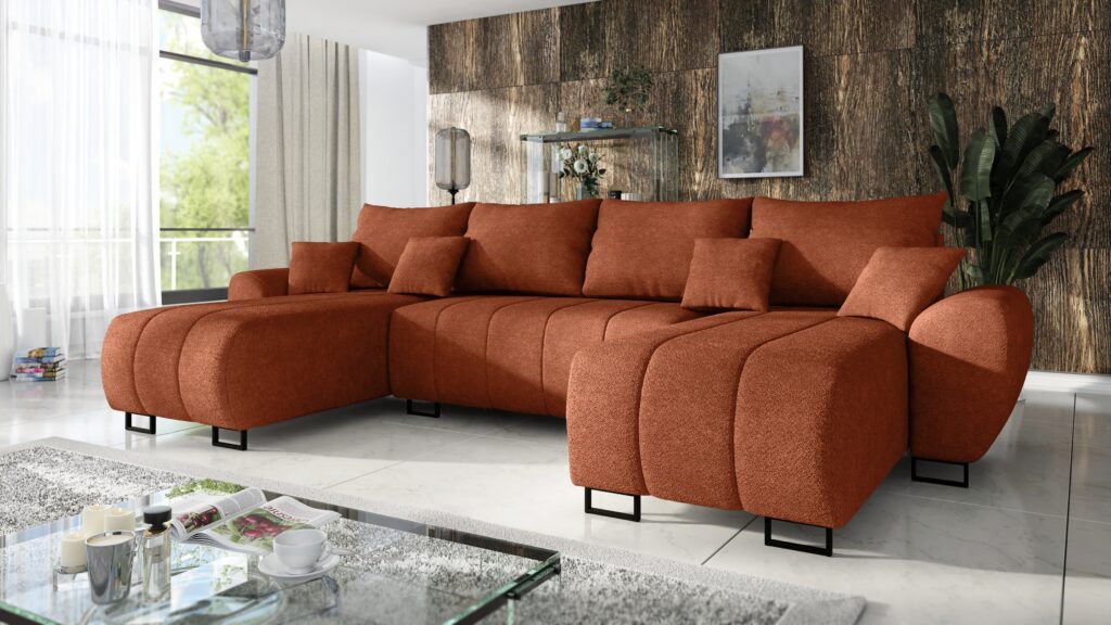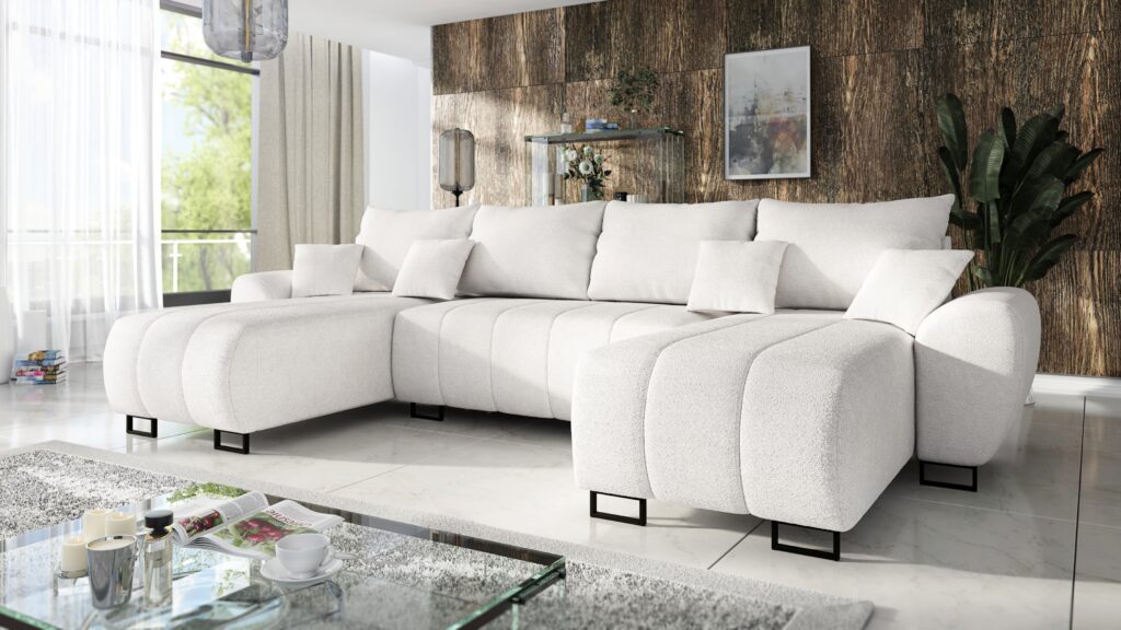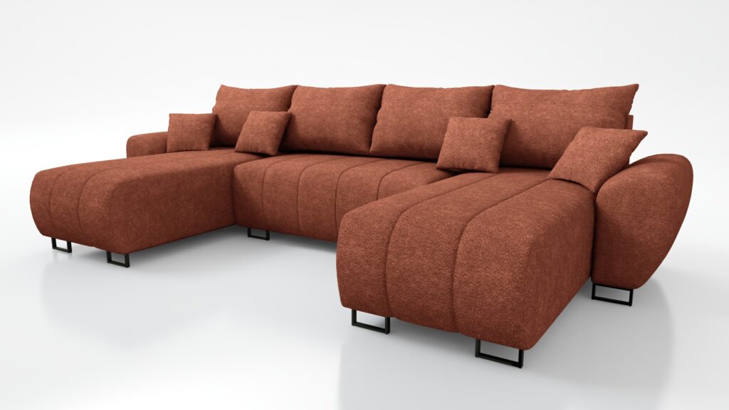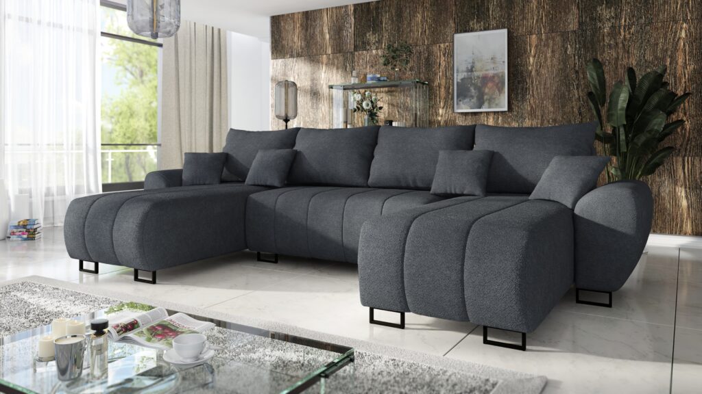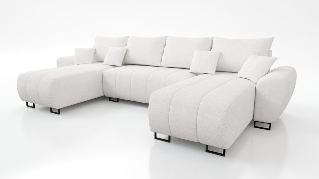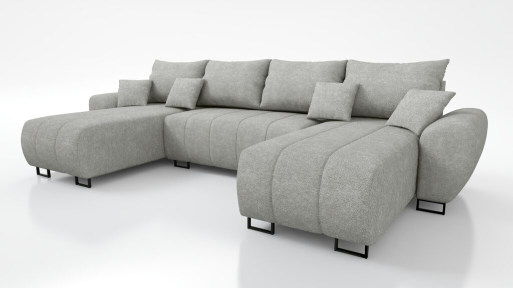 Za komfort siedziska odpowiada pianka wysokoelastyczna PUR T-30. Narożnik został wyposażony w stylowe wypukłe boczki oraz 3 duże poduszki oparciowe i 4 małe jaśki. Z przodu sofy widoczne są czarne metalowe,matowe nóżki .