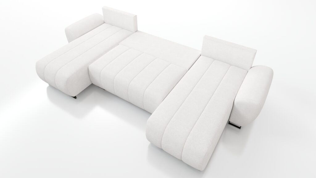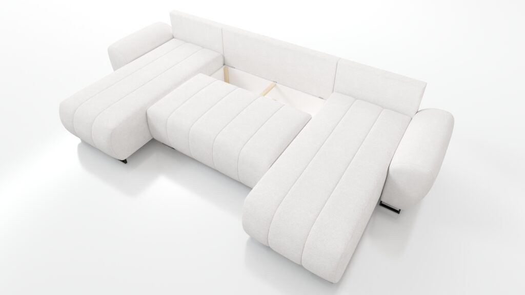 Mebel posiada funkcję spania oraz pojemnik na pościel. Narożnik jest symetryczny – co oznacza że nie trzeba wybierać strony mebla.