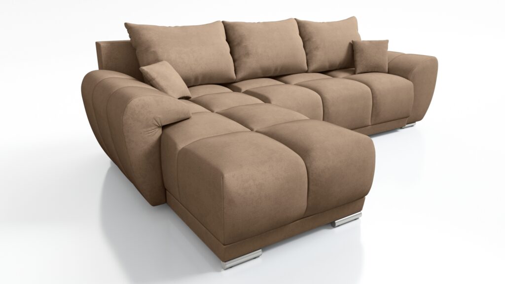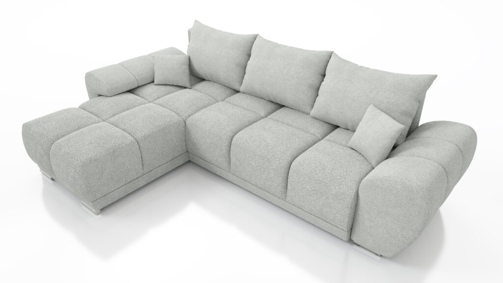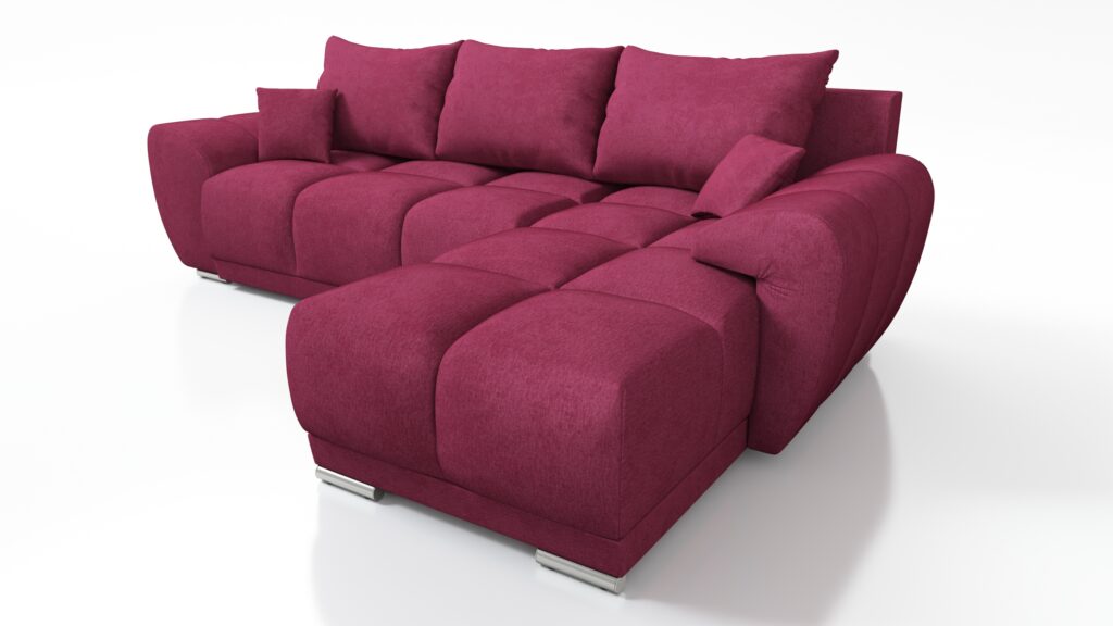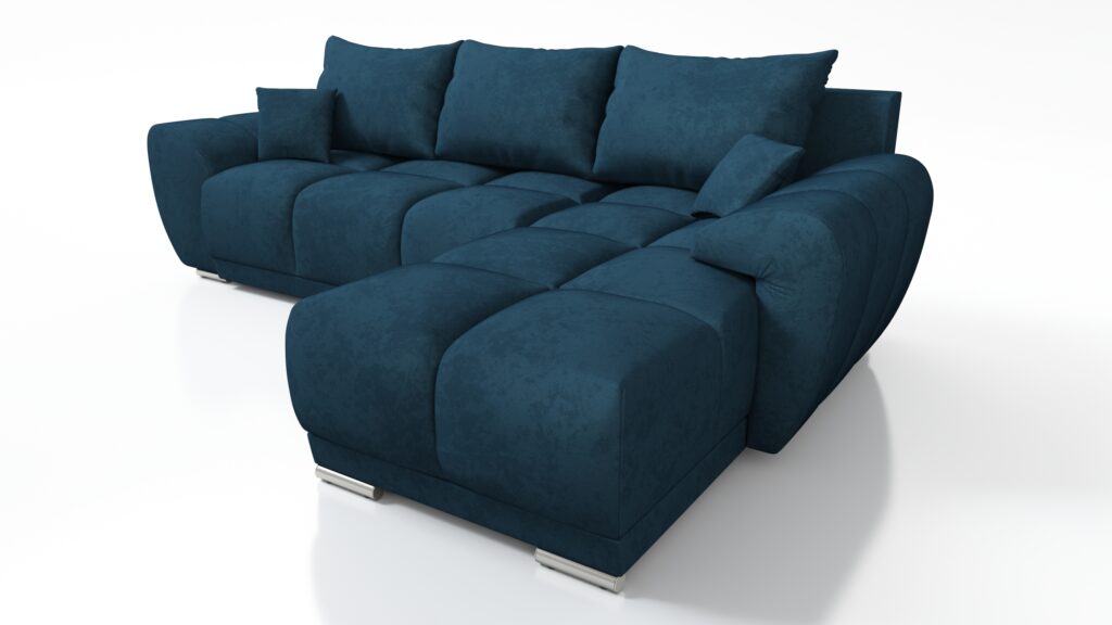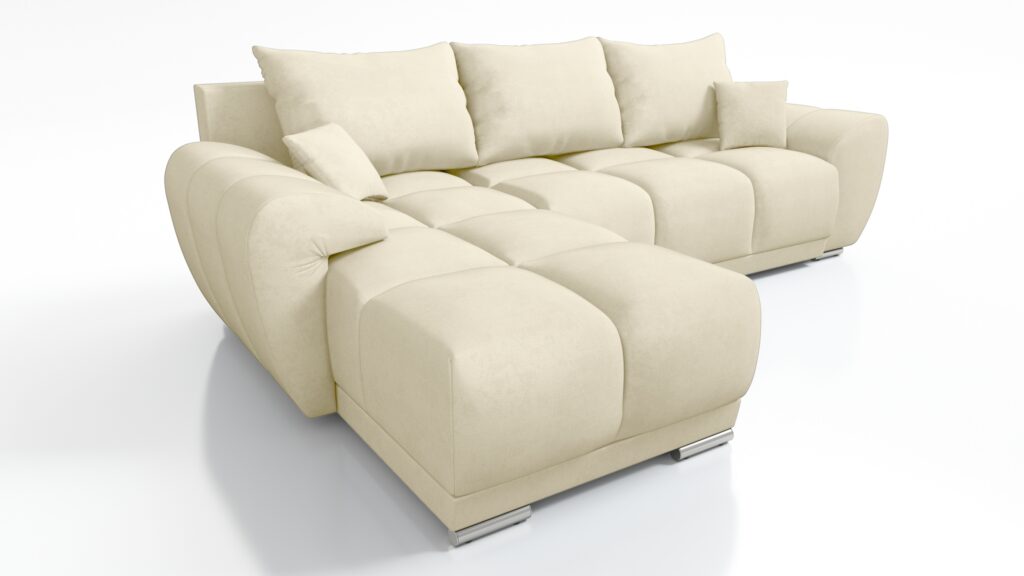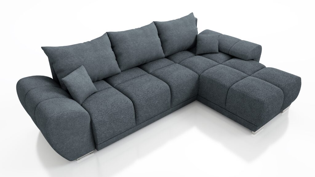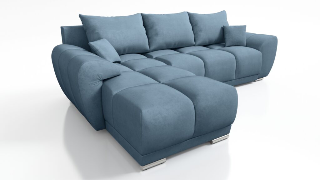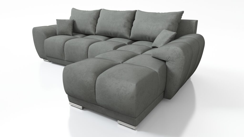 Za komfort siedziska odpowiada pianka wysokoelastyczna PUR T-30. Mebel został wyposażony w stylowe wypukłe boczki oraz 3 duże poduszki oparciowe. Z przodu narożnika widoczne są okrągłe nóżki w srebrnym kolorze.