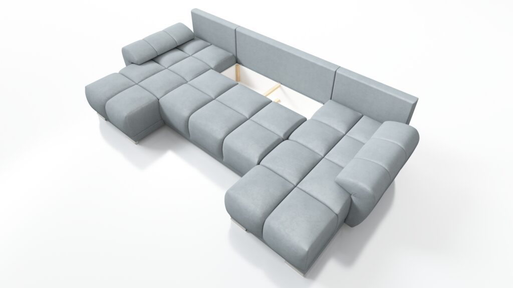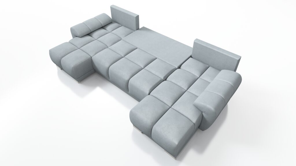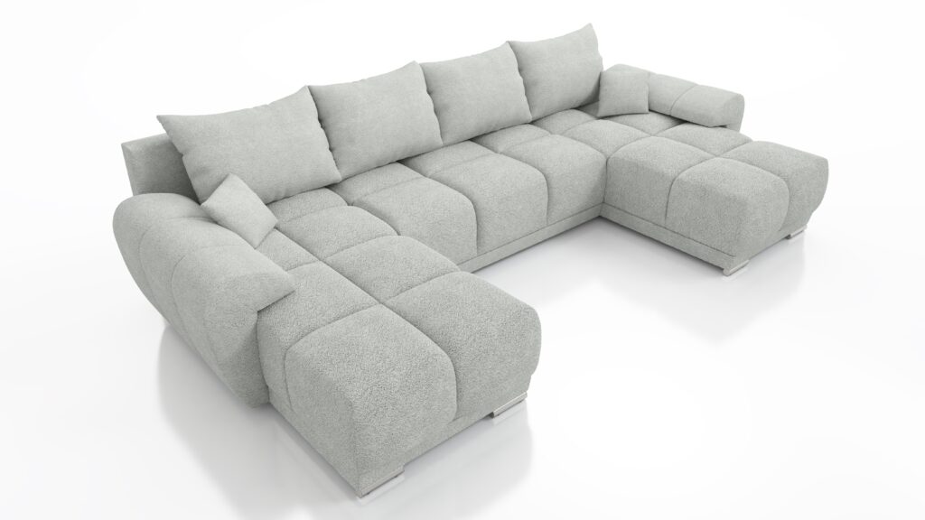 Za komfort siedziska odpowiada pianka wysokoelastyczna PUR T-30. Mebel został wyposażony w stylowe wypukłe boczki oraz 3 duże poduszki oparciowe. Z przodu narożnika widoczne są okrągłe nóżki w srebrnym kolorze.