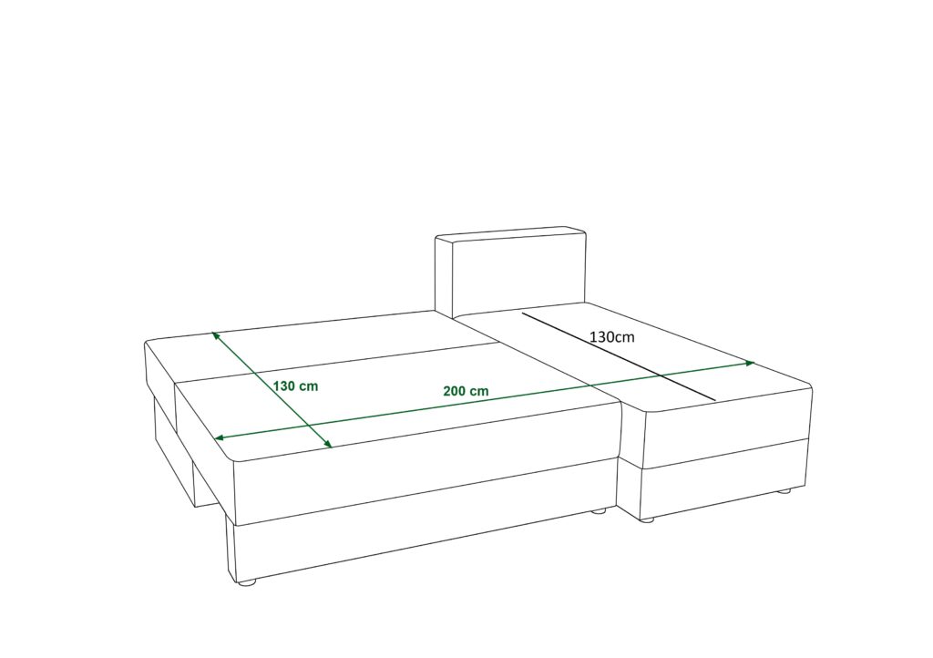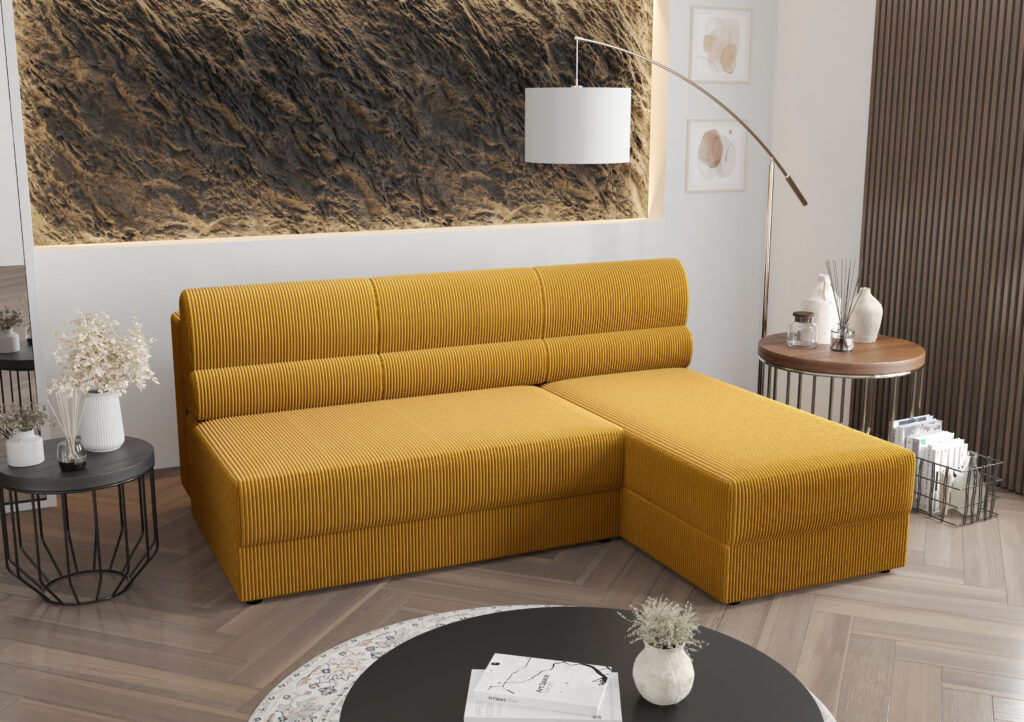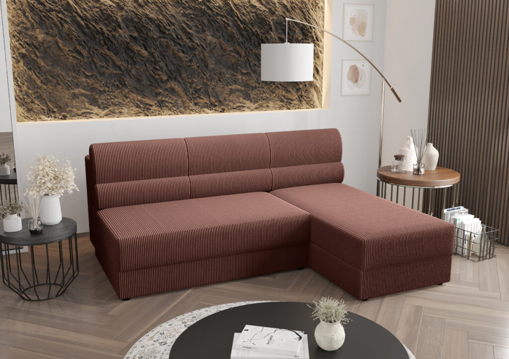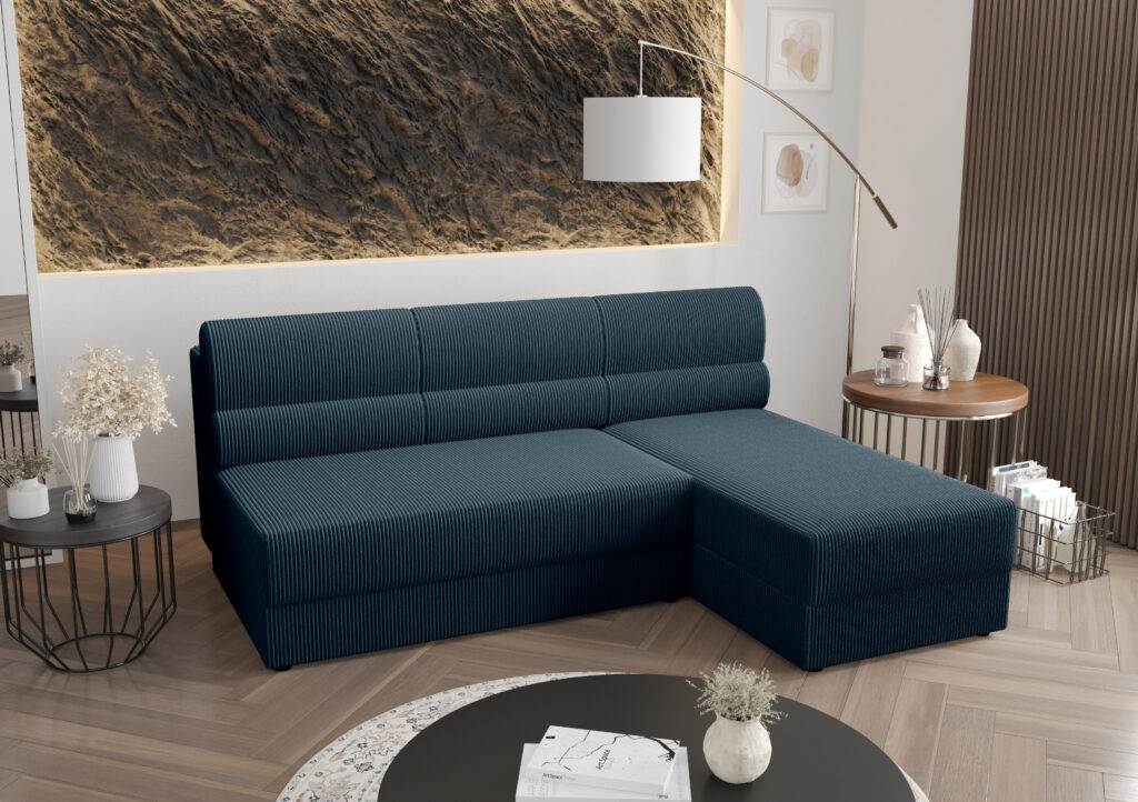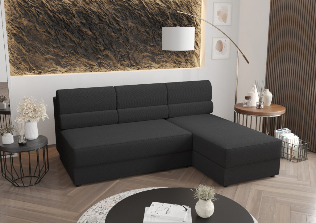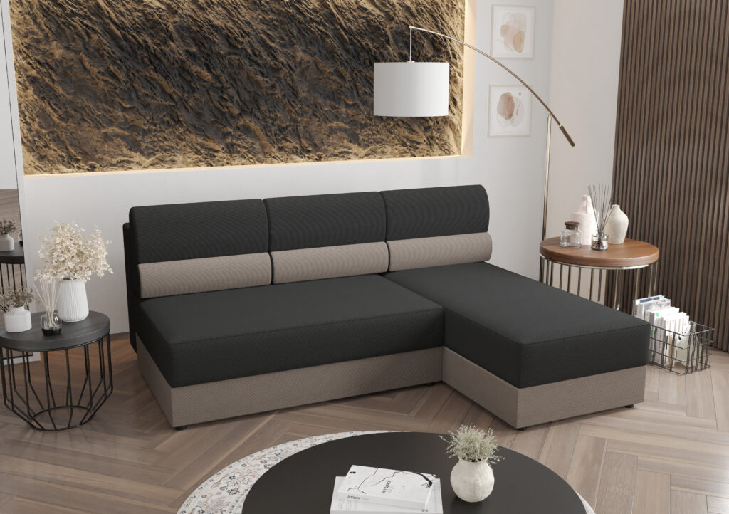 Narożnik Rebi L1 do nowoczesnego salonu z funkcją spania oraz pojemnikiem na pościel wykonany na sprężynie falistej.