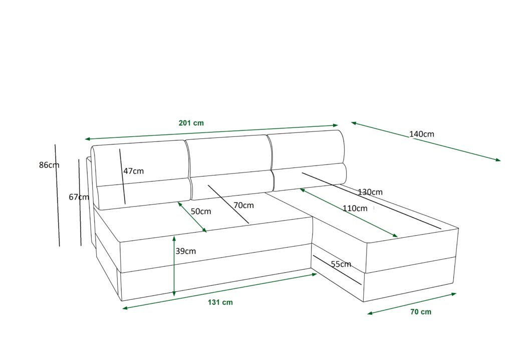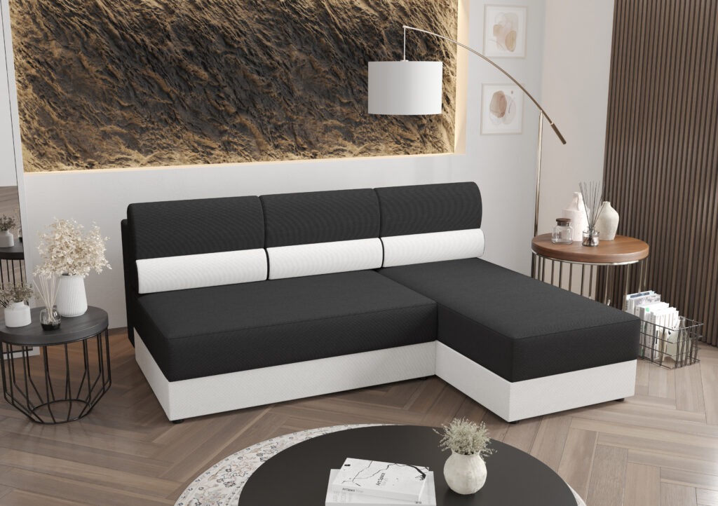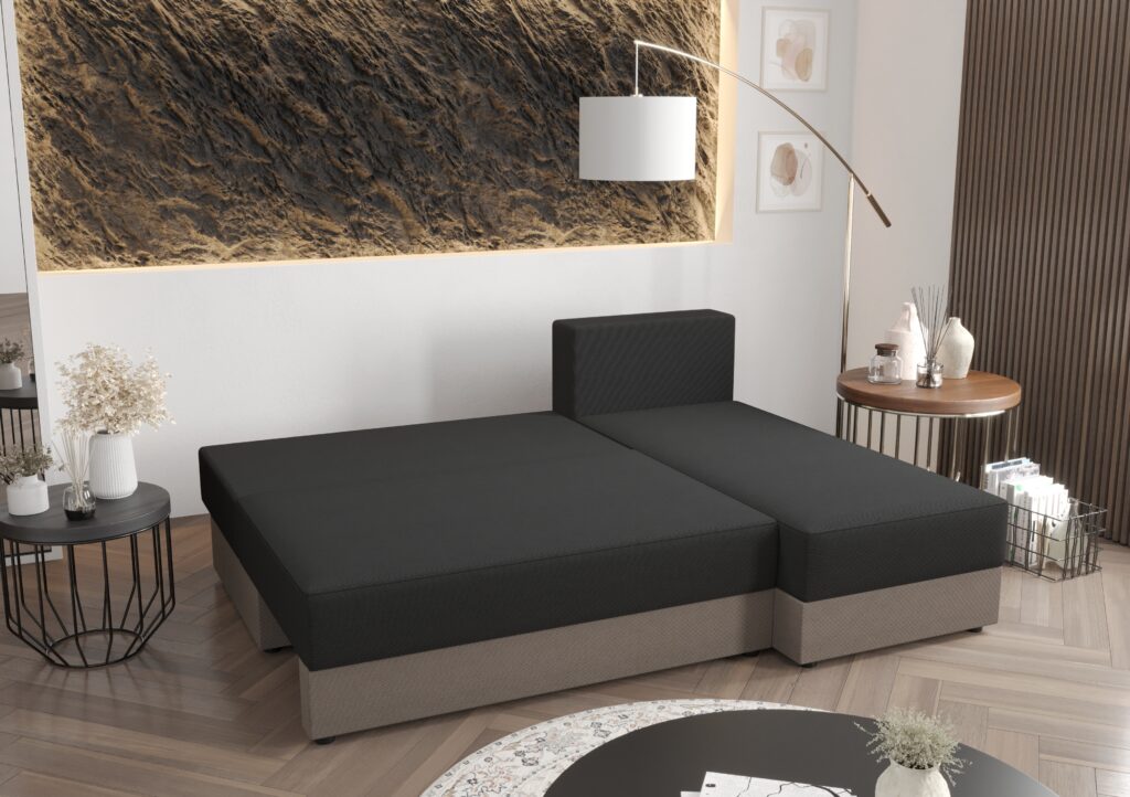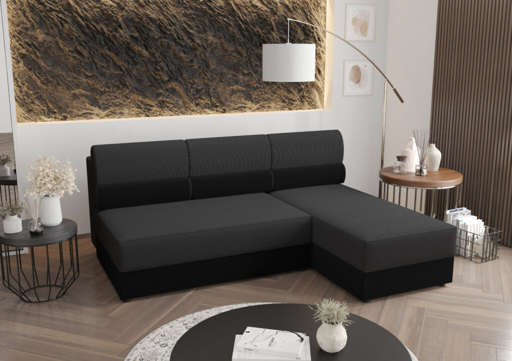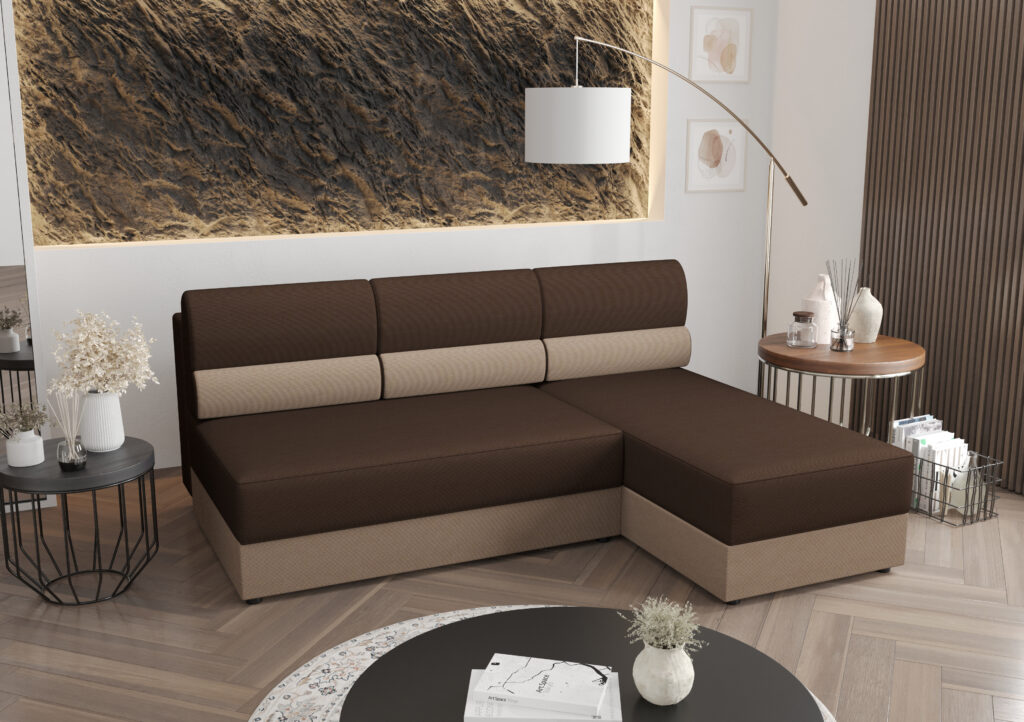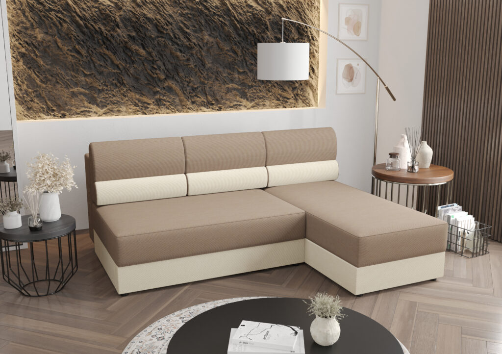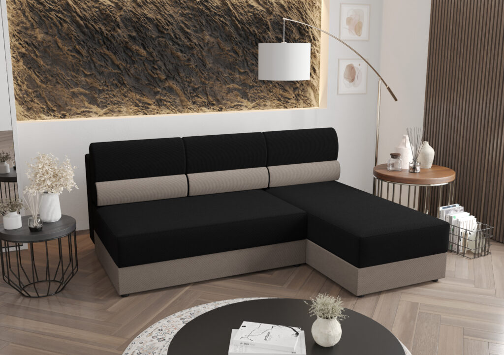 Narożnik Rebi L1 do nowoczesnego salonu z funkcją spania oraz pojemnikiem na pościel wykonany na sprężynie falistej.