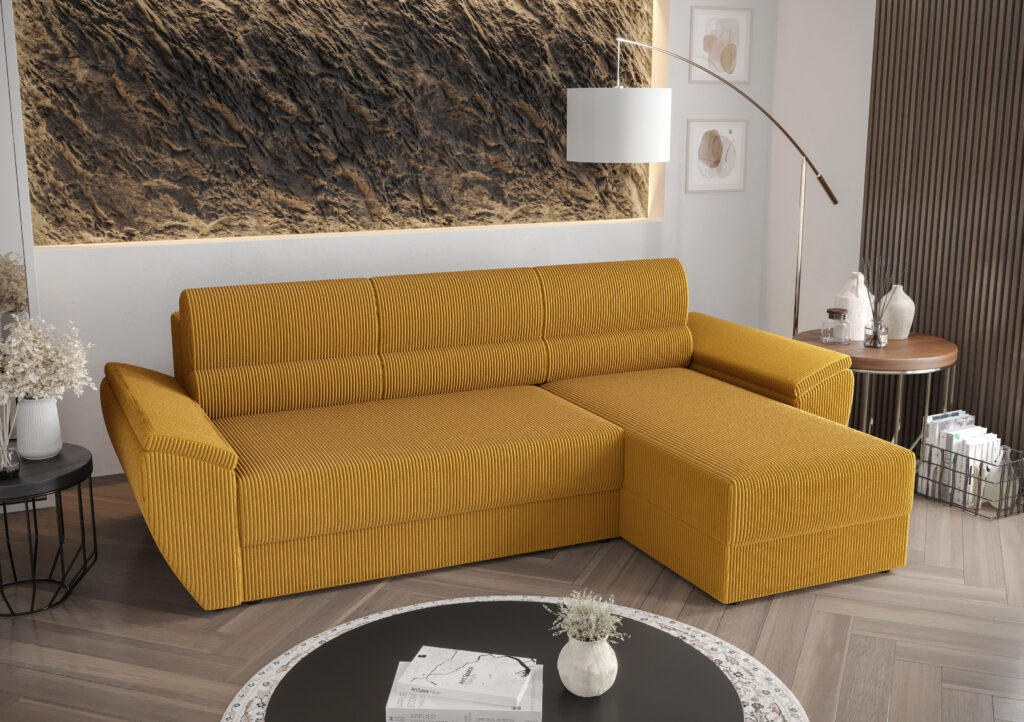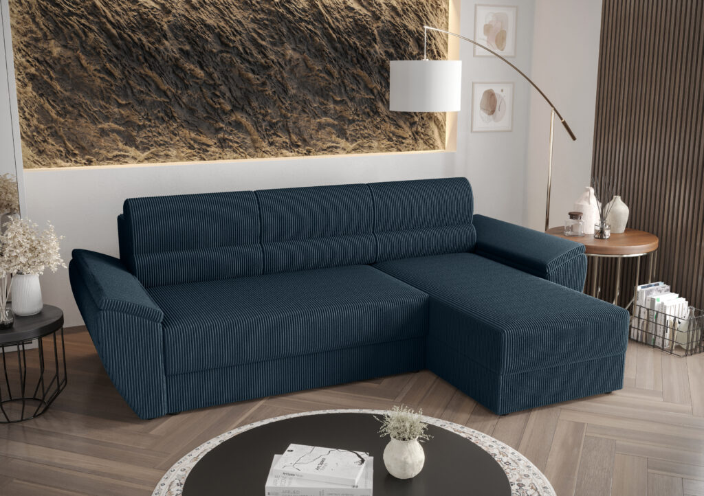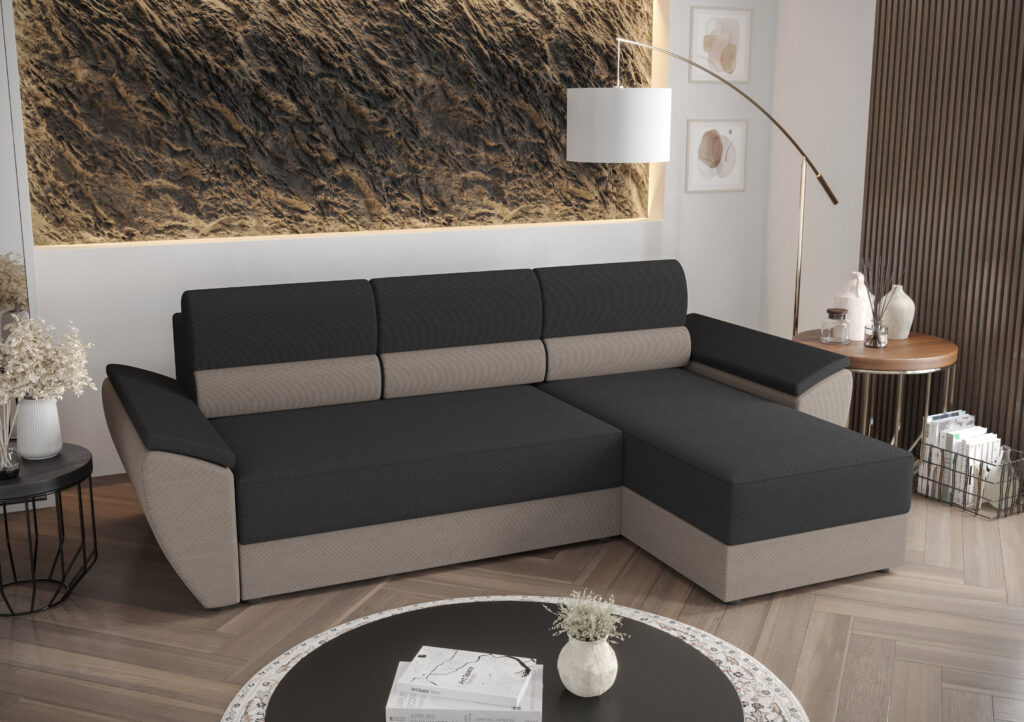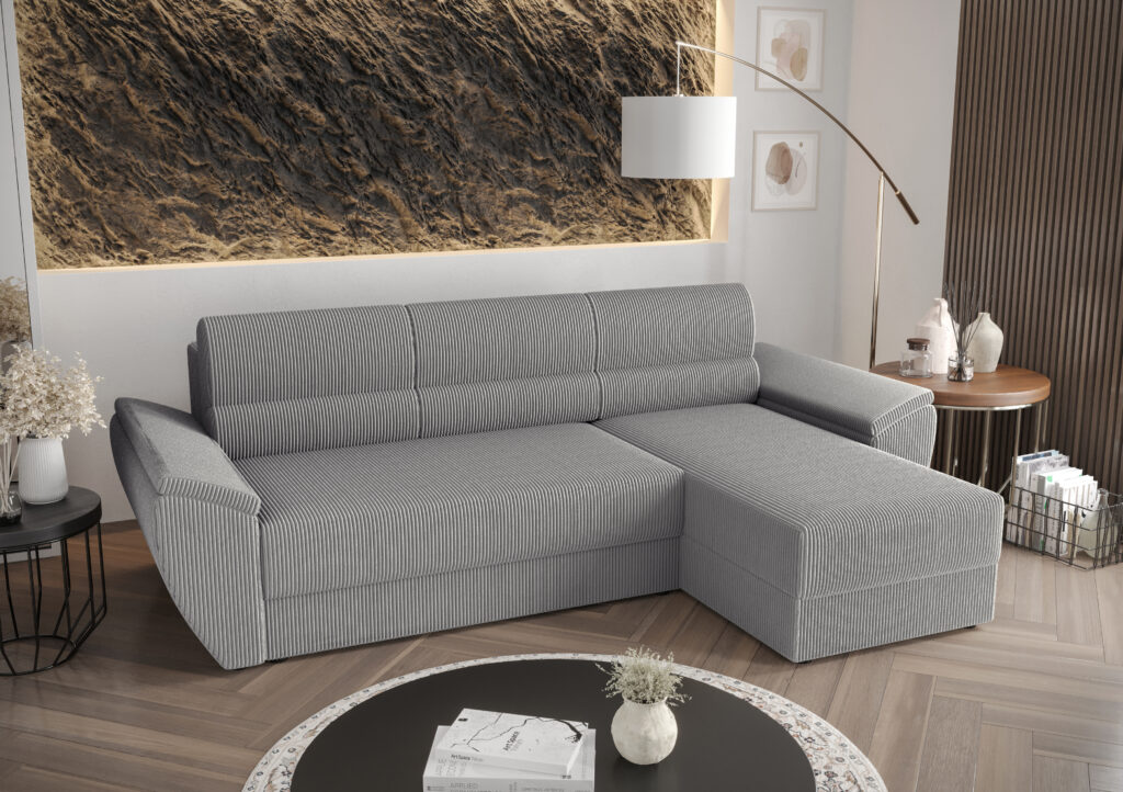Narożnik Rebi L2 do nowoczesnego salonu z funkcją spania oraz pojemnikiem na pościel wykonany na sprężynie falistej.