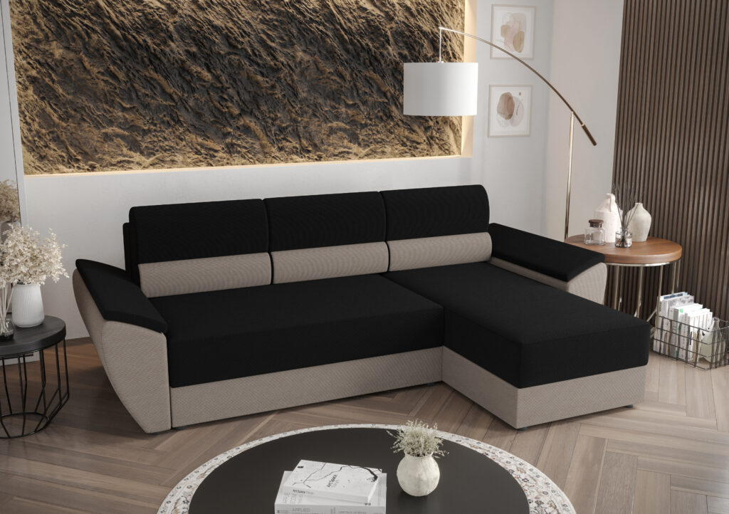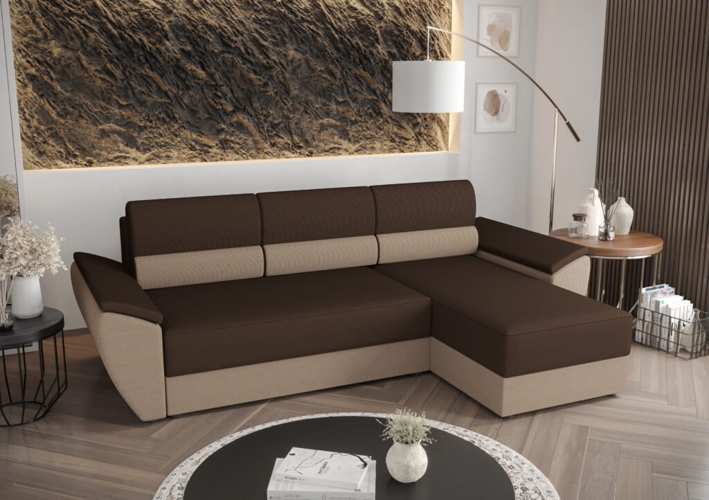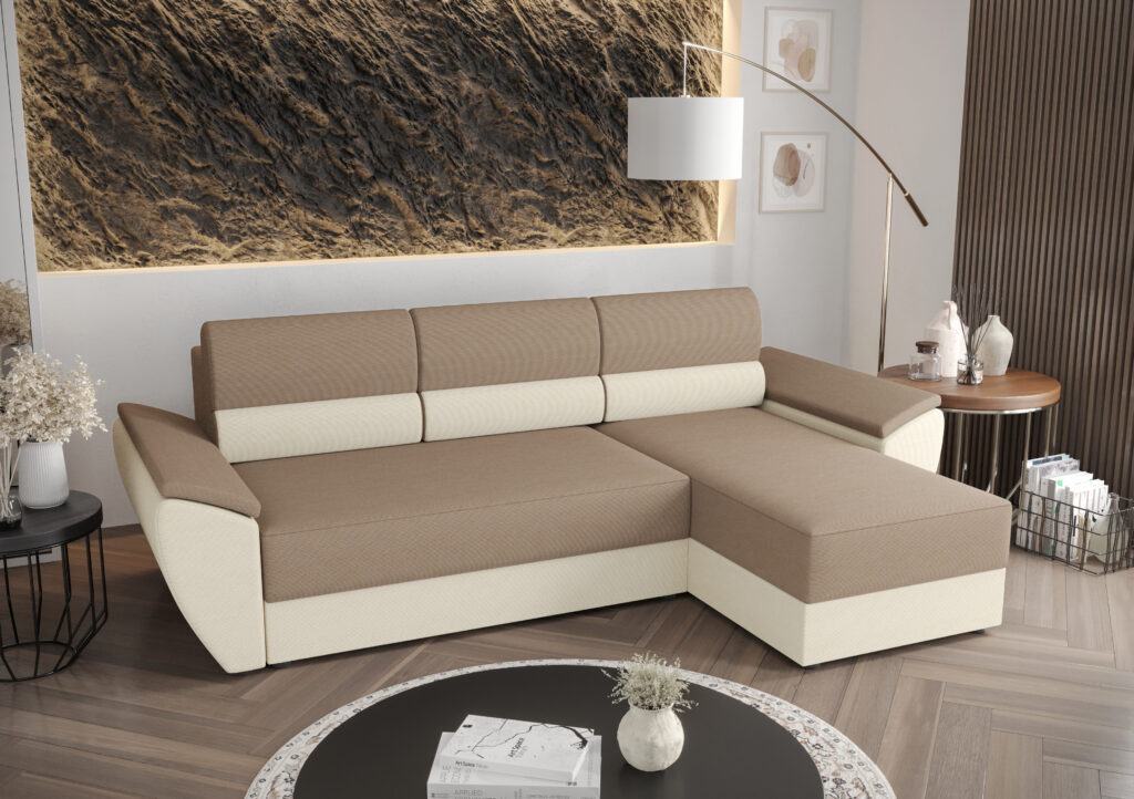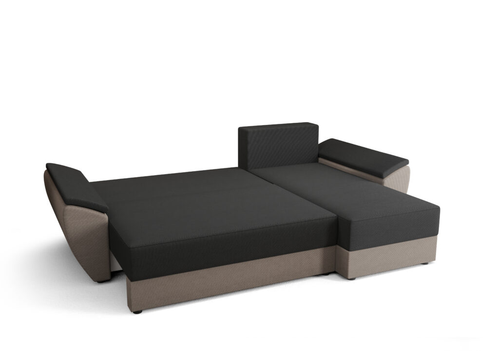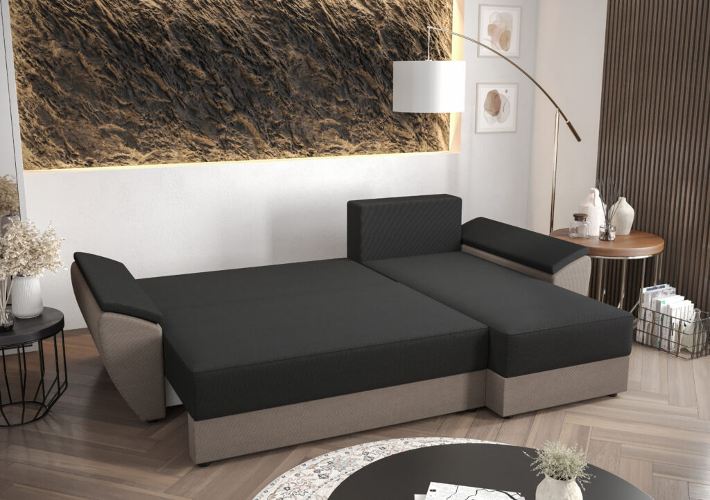 Narożnik Rebi L2 do nowoczesnego salonu z funkcją spania oraz pojemnikiem na pościel wykonany na sprężynie falistej.
