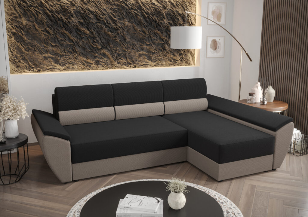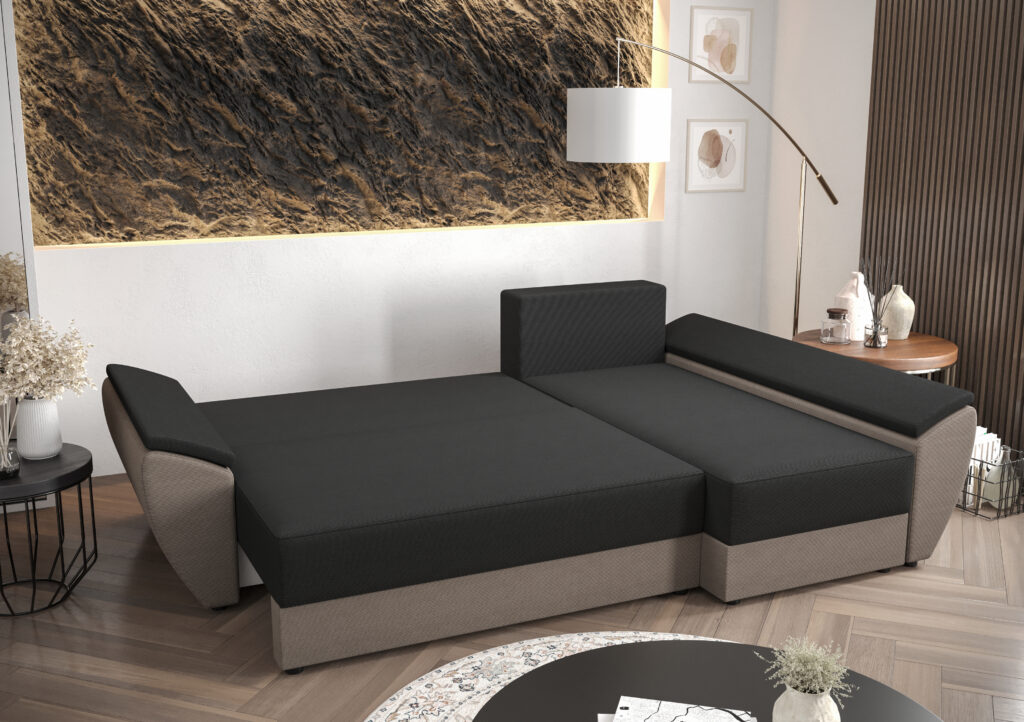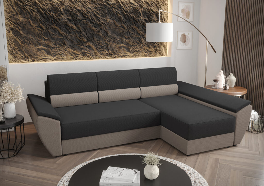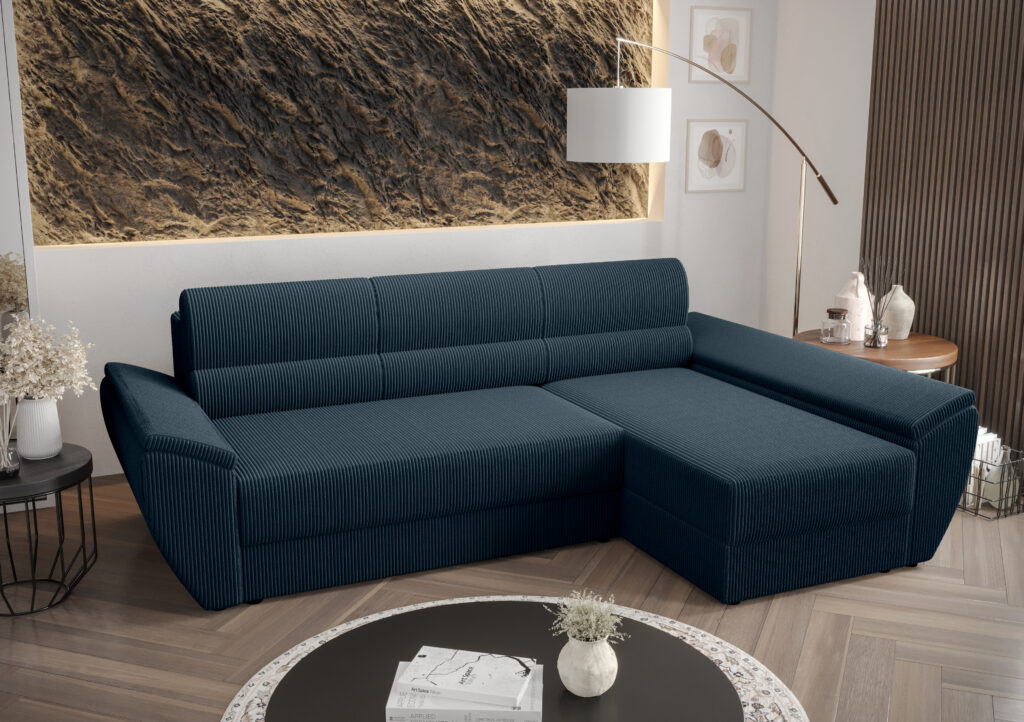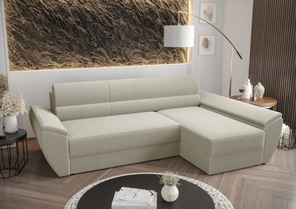 Narożnik Rebi L3 do nowoczesnego salonu z funkcją spania oraz pojemnikiem na pościel wykonany na sprężynie falistej.