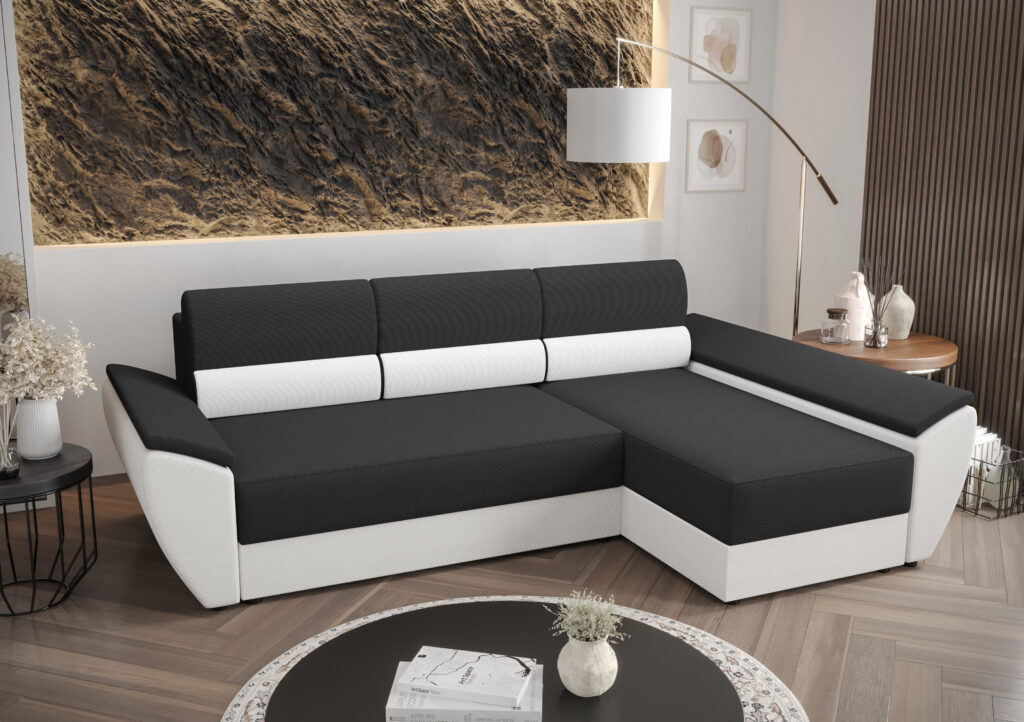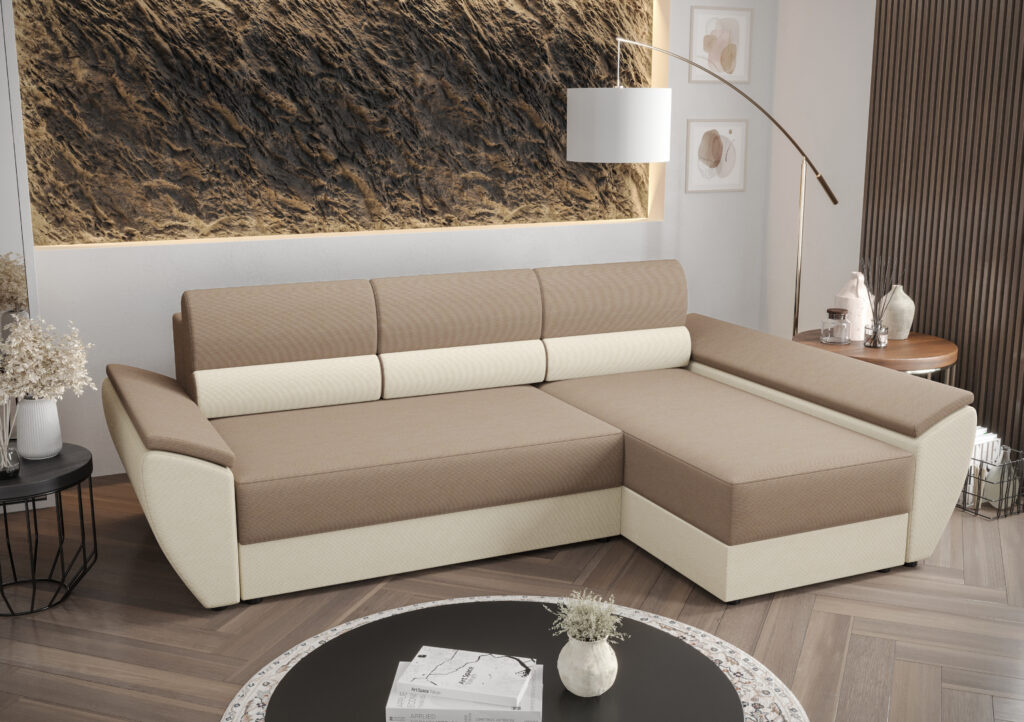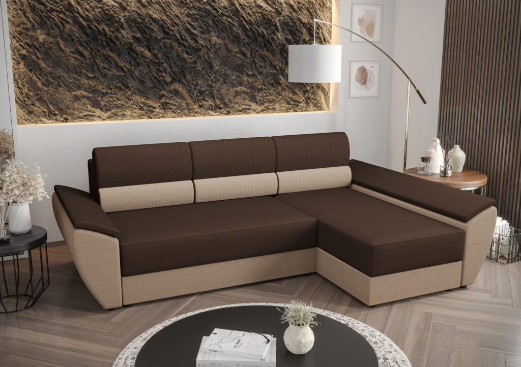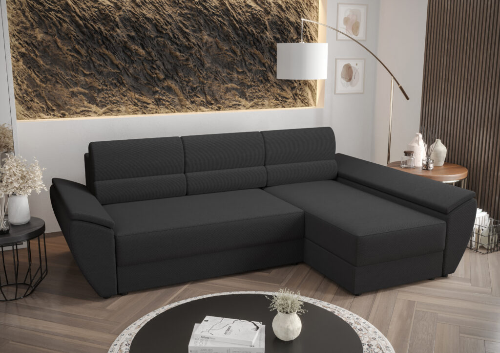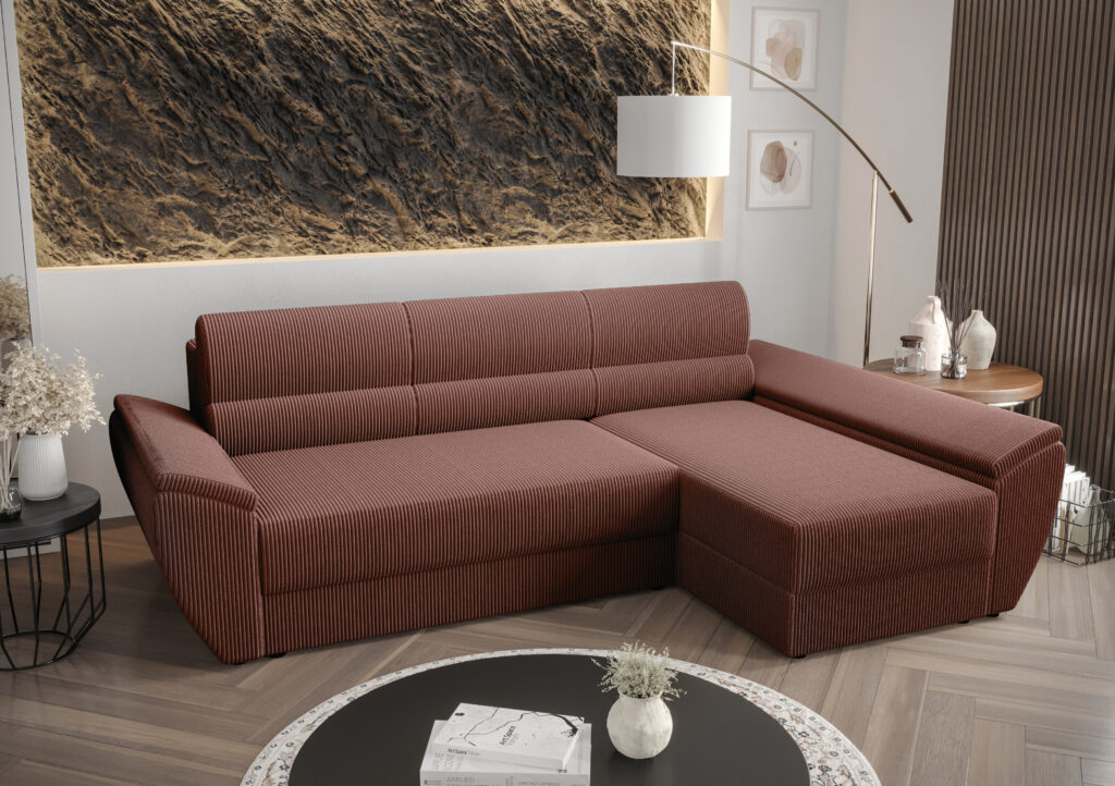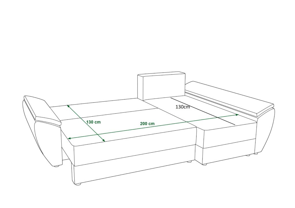 Narożnik Rebi L3 do nowoczesnego salonu z funkcją spania oraz pojemnikiem na pościel wykonany na sprężynie falistej.