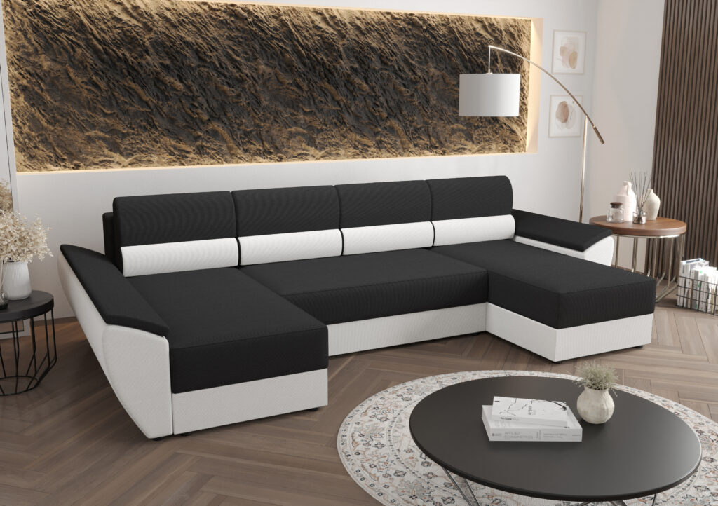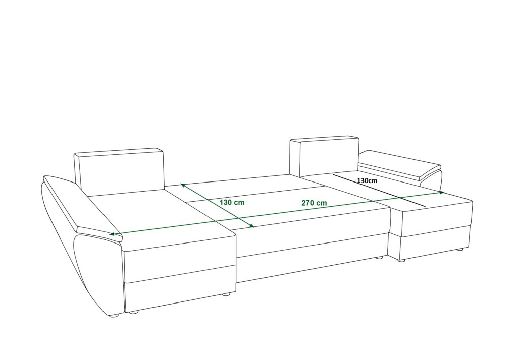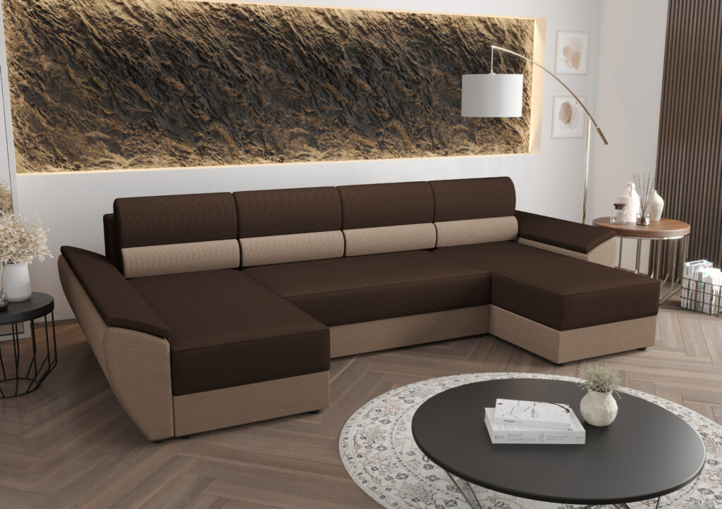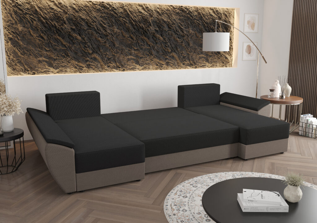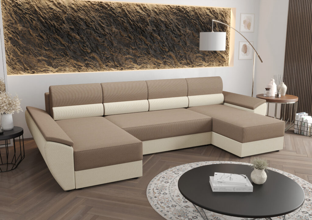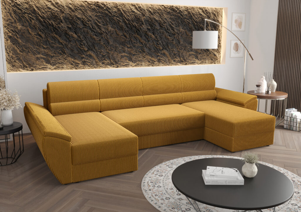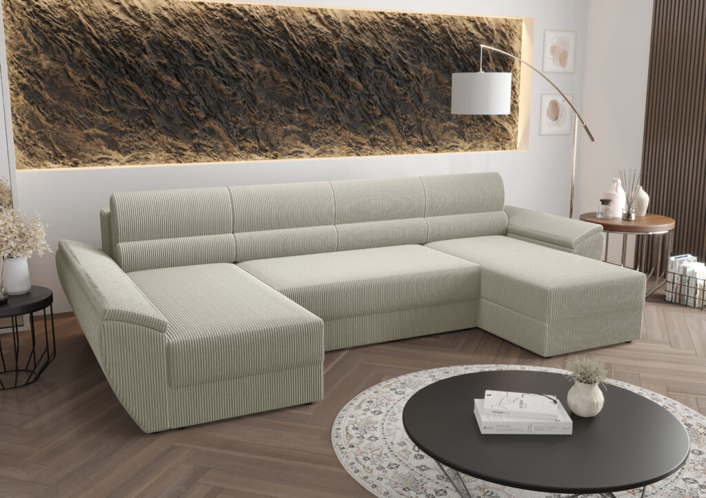 Narożnik Rebi U3 do nowoczesnego salonu z funkcją spania oraz pojemnikiem na pościel wykonany na sprężynie falistej.