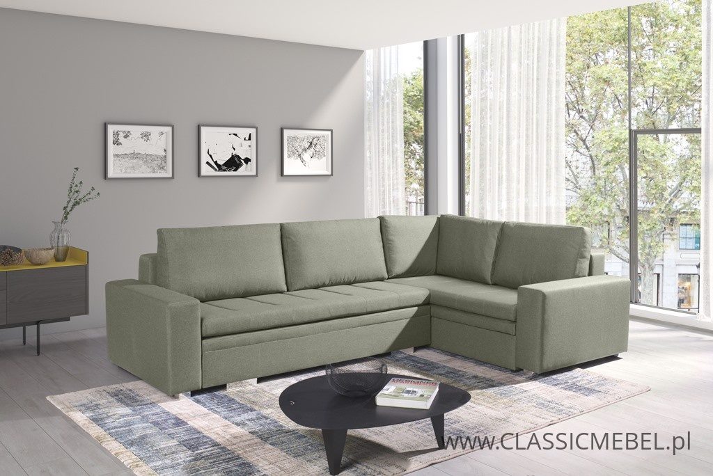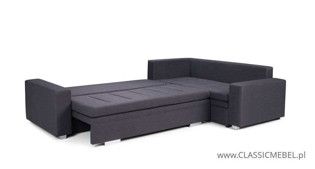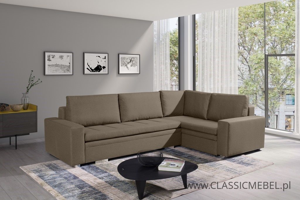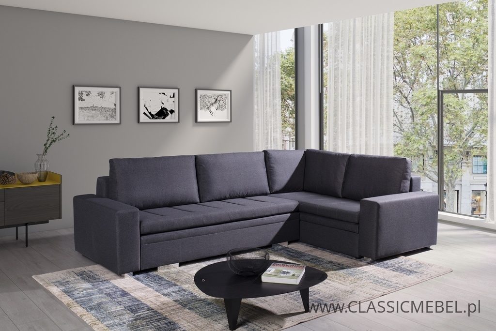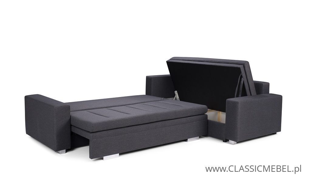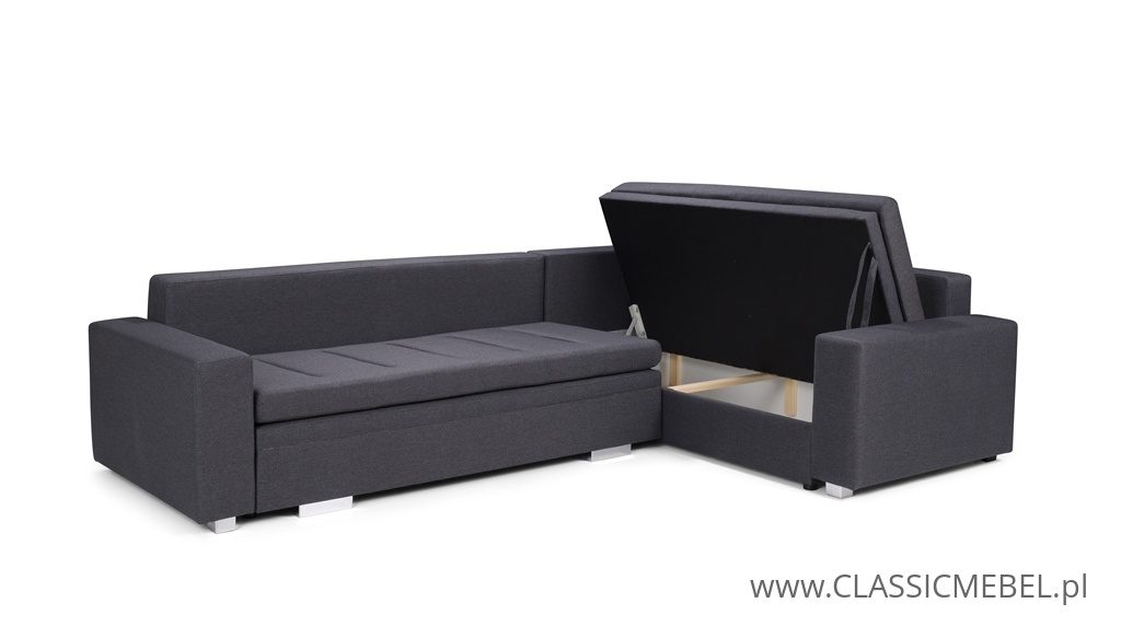 Nowoczesny narożnik TIA z funkcją spania, z obszernymi pojemnikami na pościel (2 pojemniki), wykonany na sprężynie falistej. Producent zastosował piankę wysokoelastyczną o podwyższonej twardości T30. Nóżki w narożniku są chromowane.