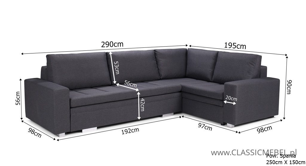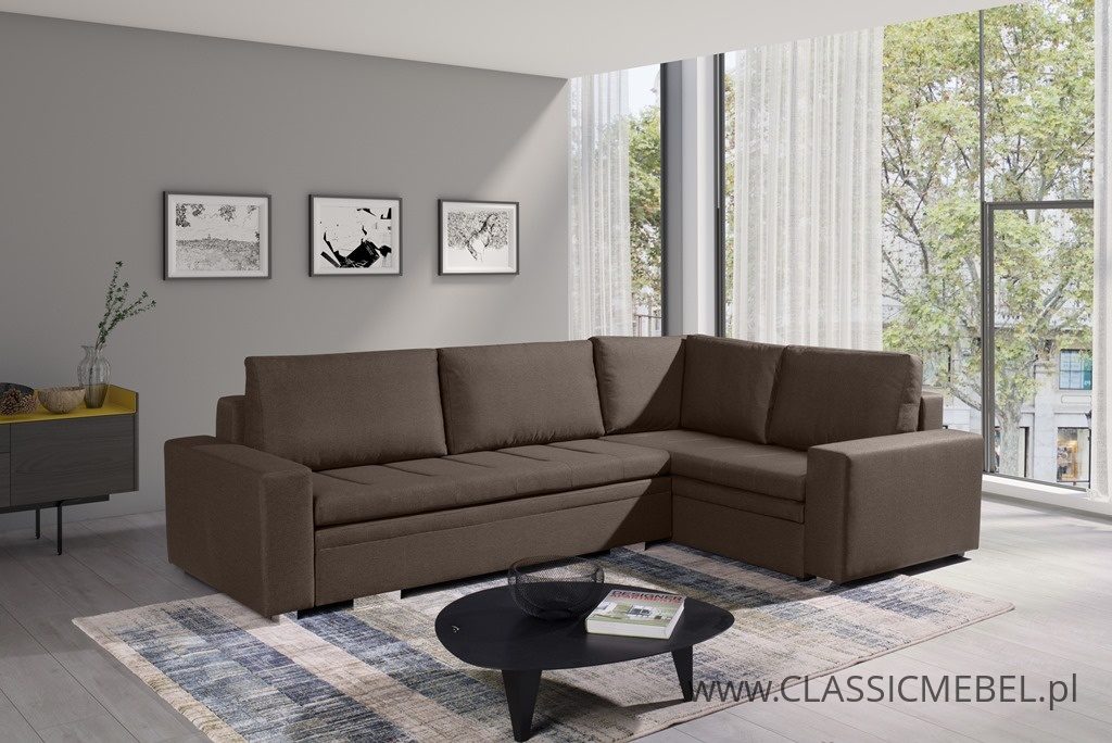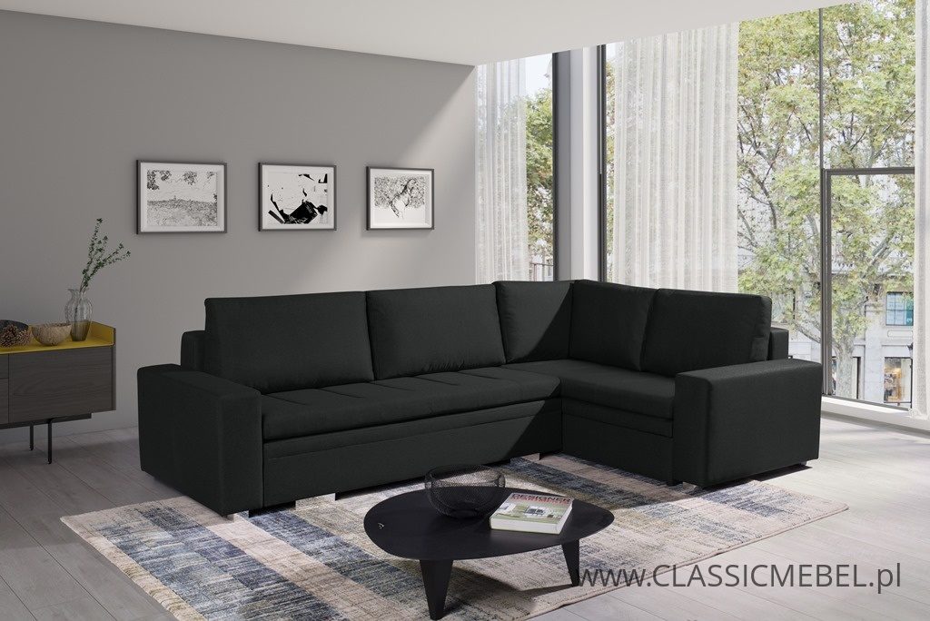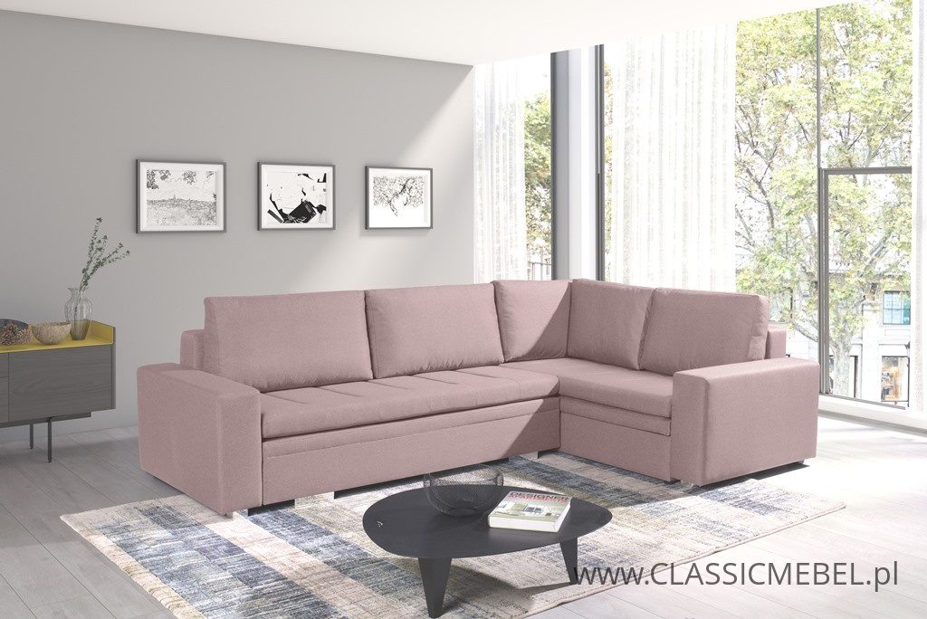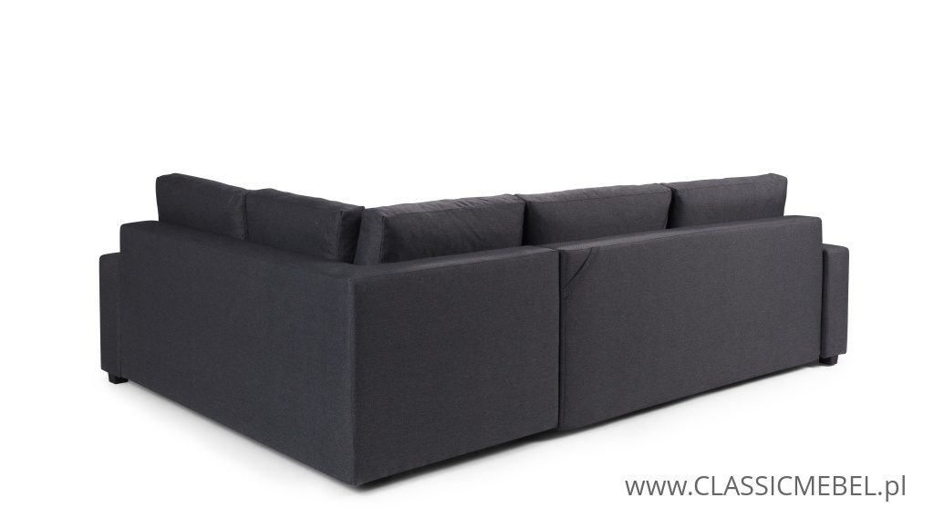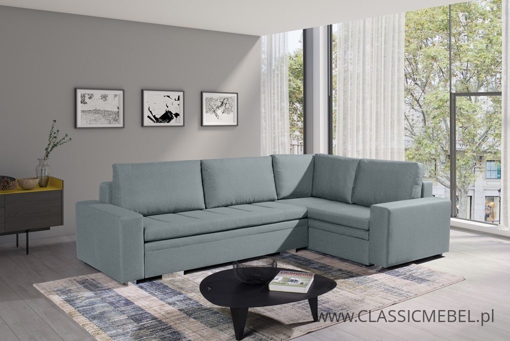Nowoczesny narożnik TIA z funkcją spania, z obszernymi pojemnikami na pościel (2 pojemniki), wykonany na sprężynie falistej. Producent zastosował piankę wysokoelastyczną o podwyższonej twardości T30. Nóżki w narożniku są chromowane.