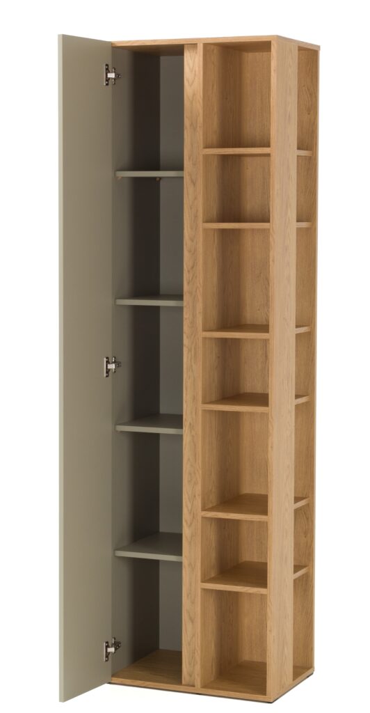 Cena dotyczy regału wysokiego z półkami Luca LC4 w kolorze eukaliptus / dąb baltic dune widocznego na zdjęciu poniżej.
