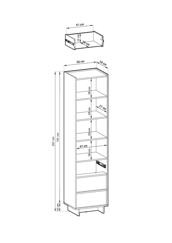 – szerokość 50 cm / wysokość 201 cm / głębokość 39 cm