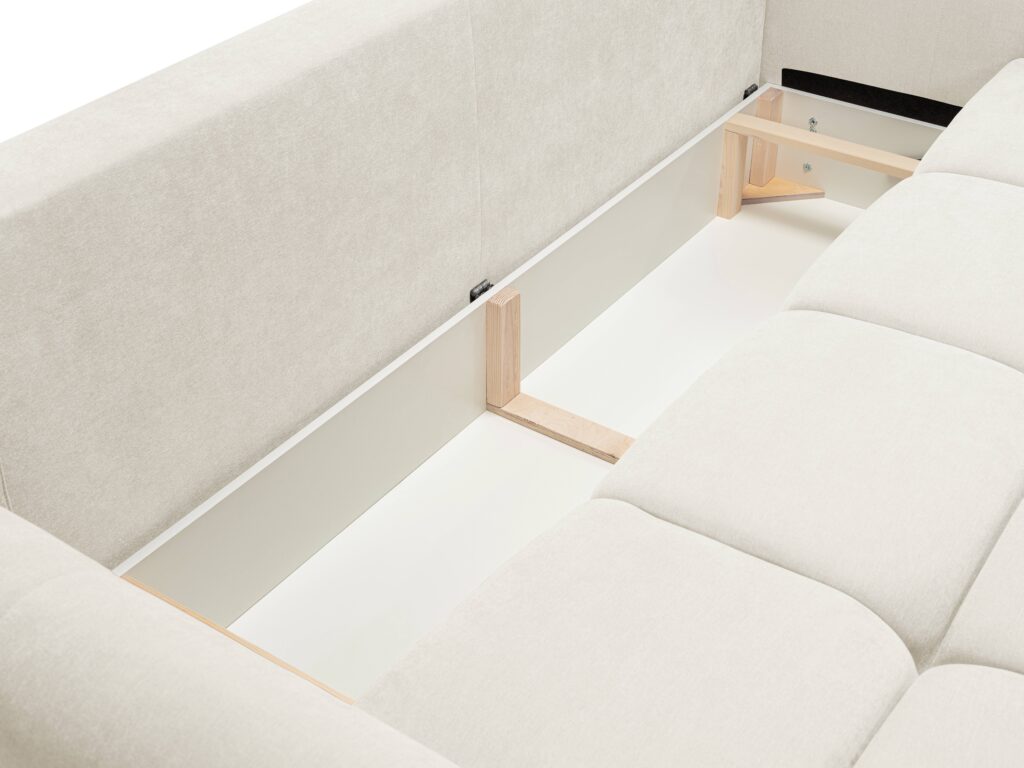 Super wygodna, nowoczesna sofa Base do salonu z funkcją spania oraz pojemnikiem na pościel wykonana na sprężynie falistej.