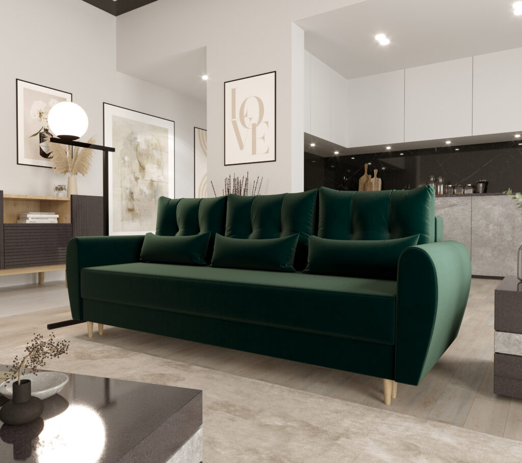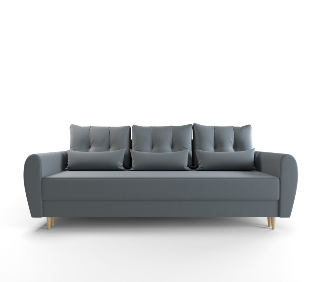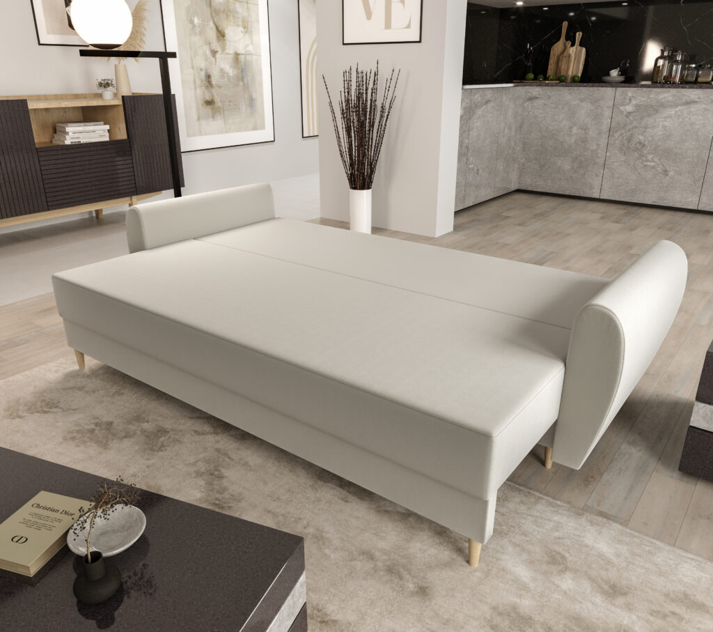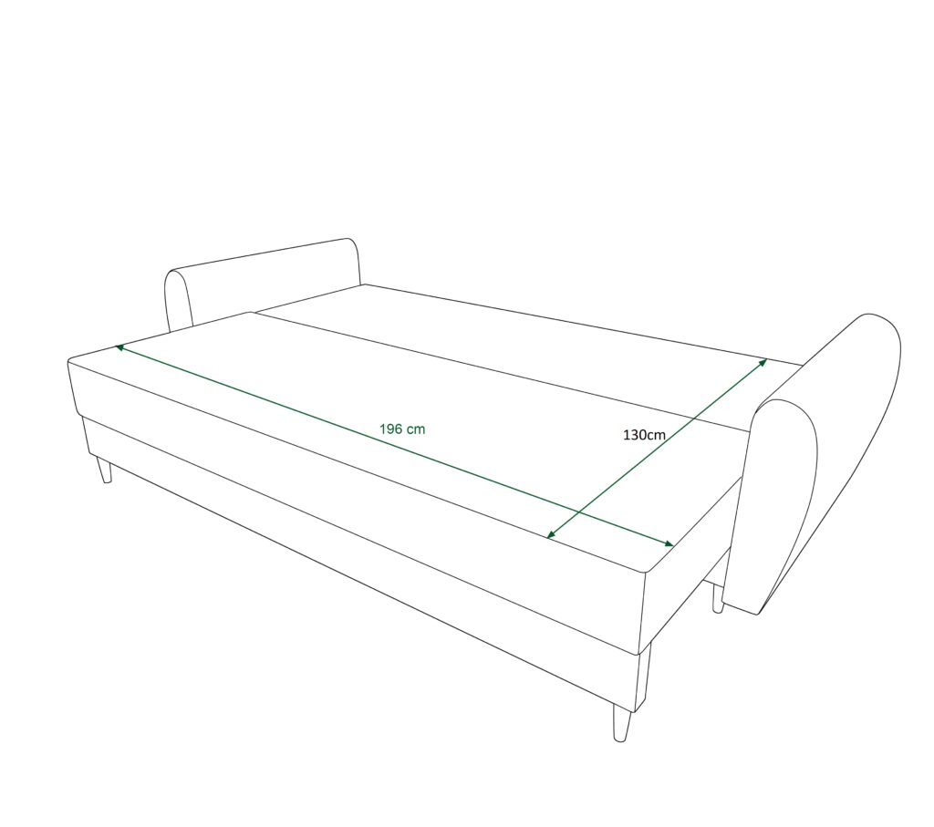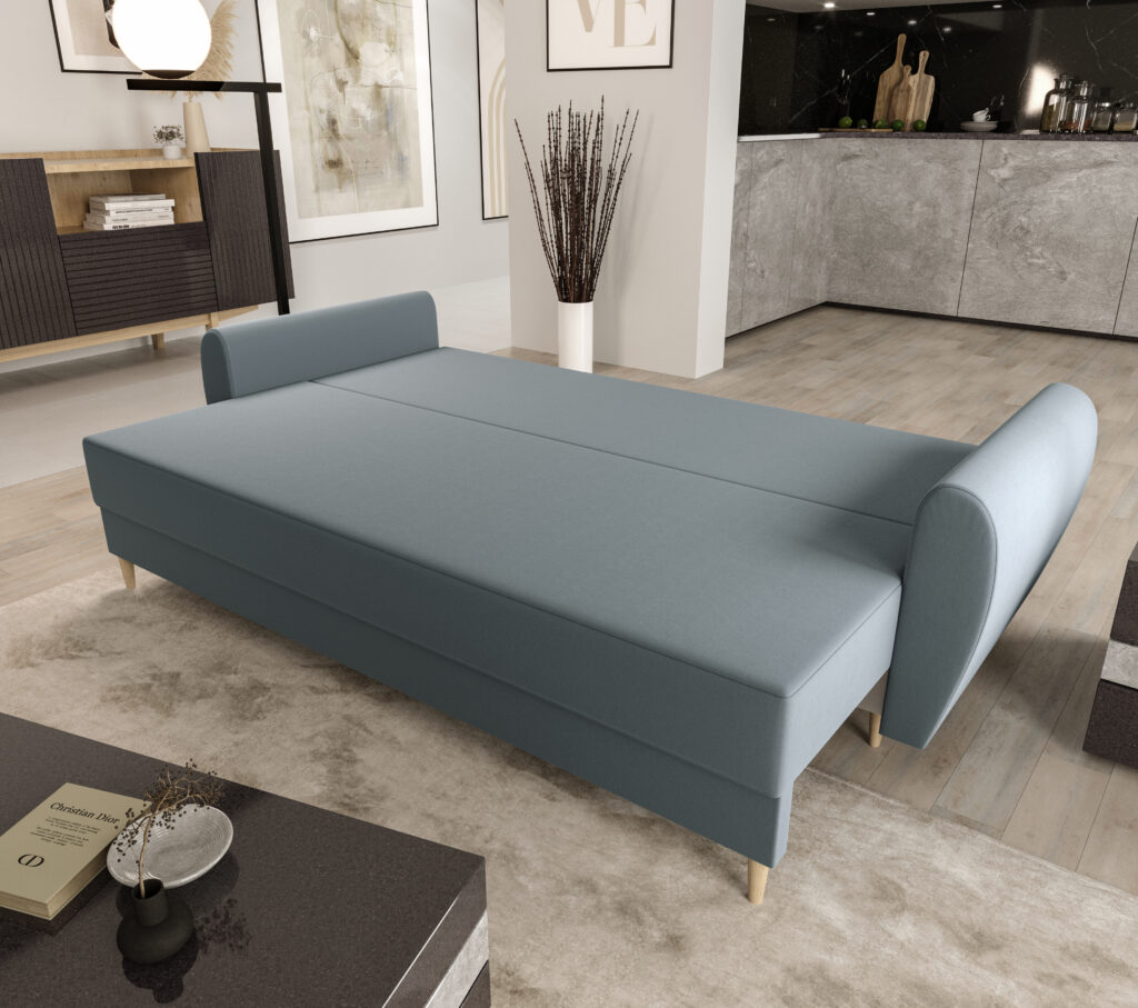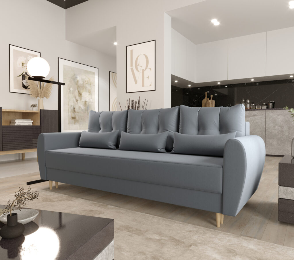 Sofa Palermo do nowoczesnego salonu z funkcją spania oraz pojemnikiem na pościel wykonana na sprężynie falistej.