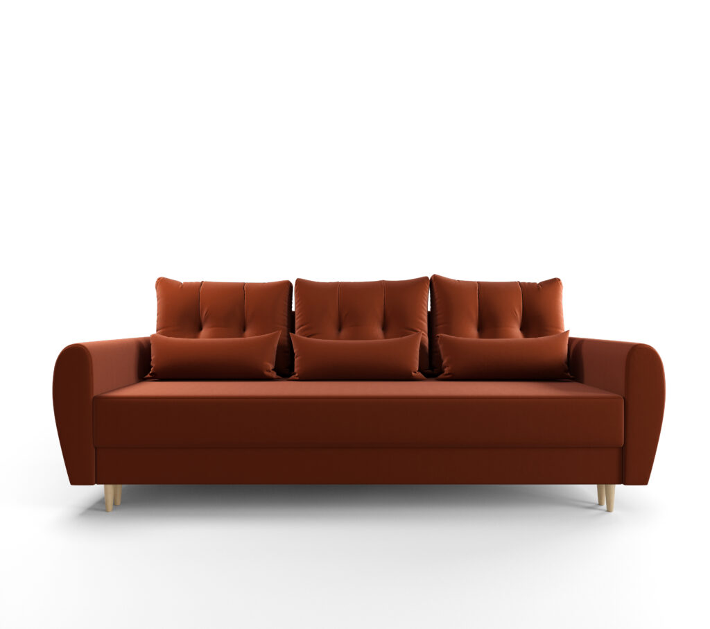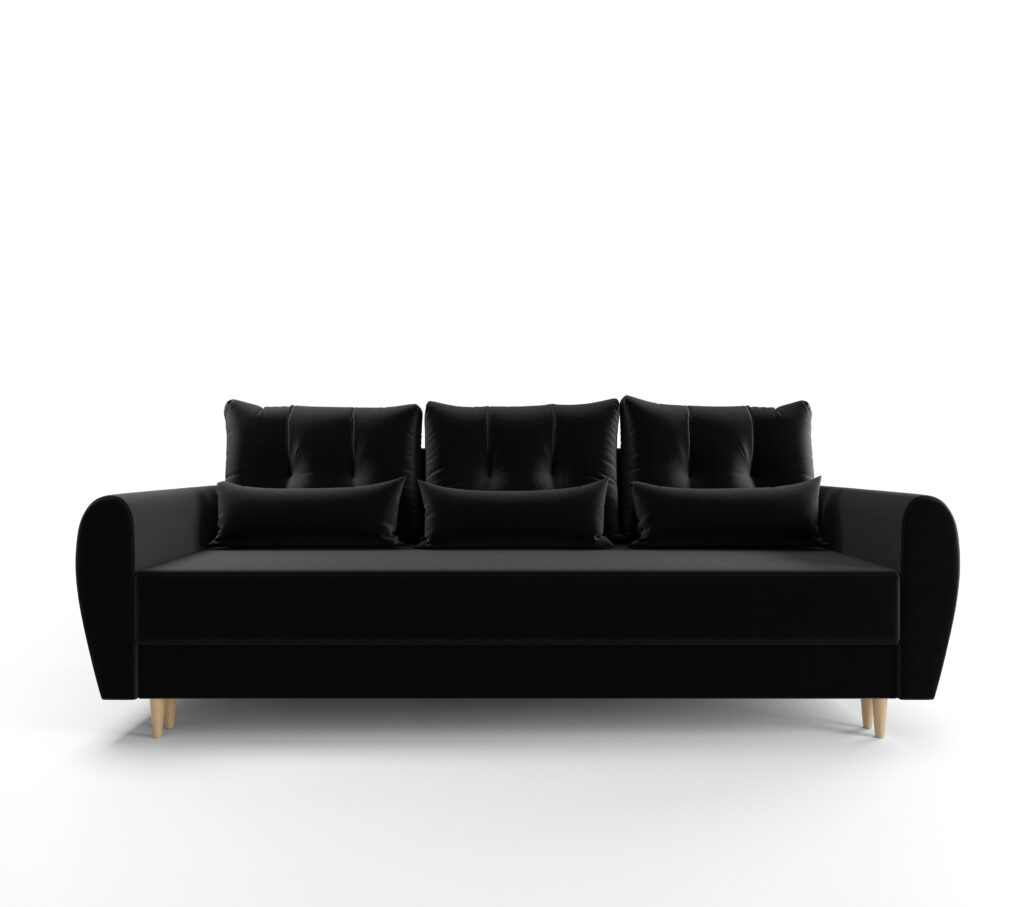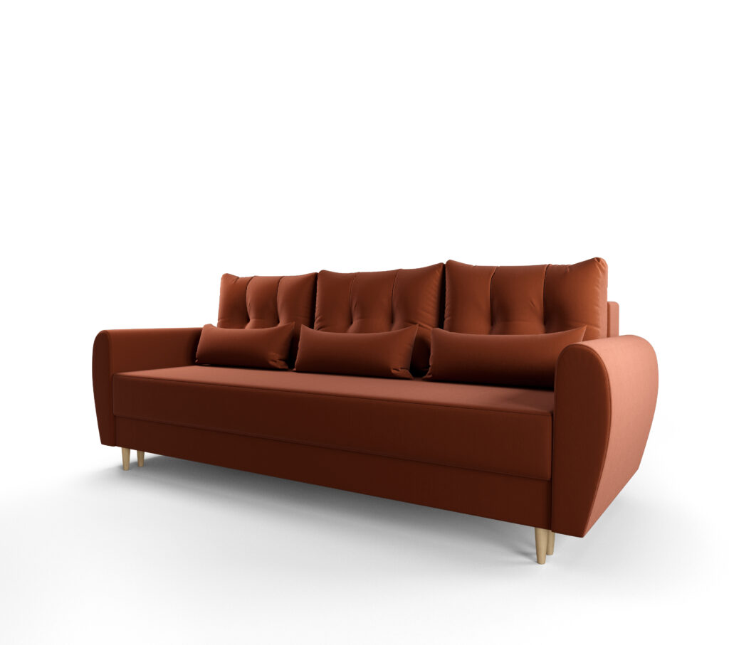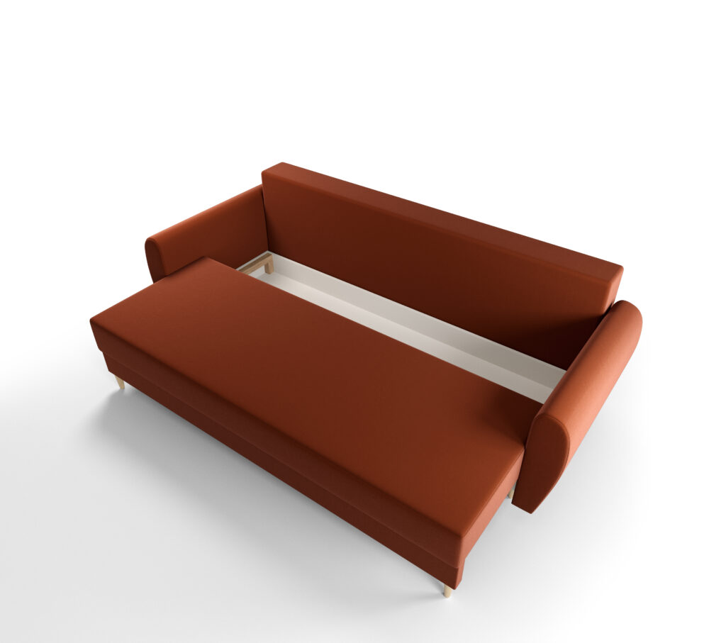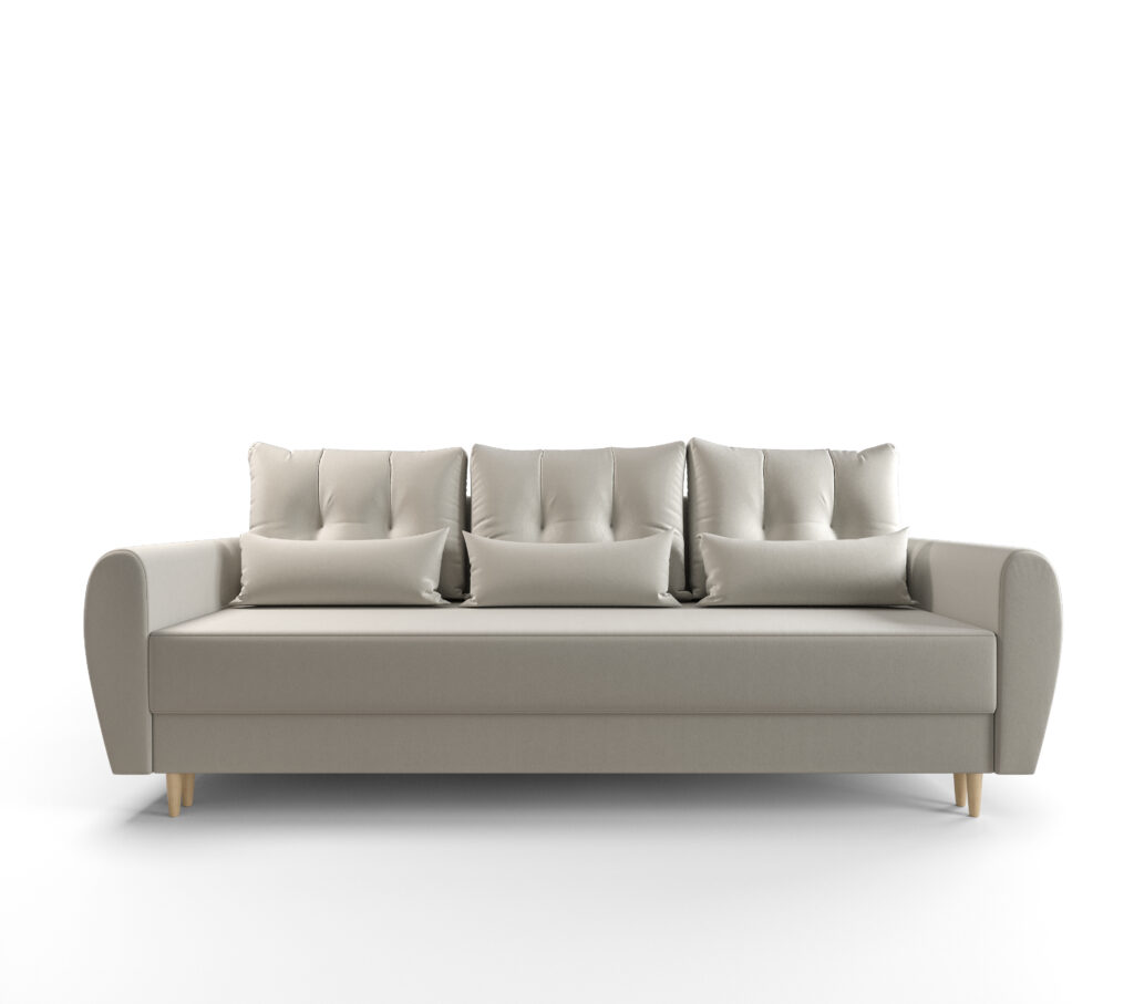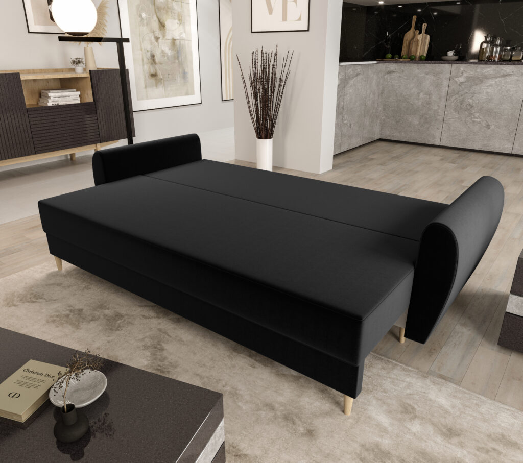 Sofa Palermo do nowoczesnego salonu z funkcją spania oraz pojemnikiem na pościel wykonana na sprężynie falistej.