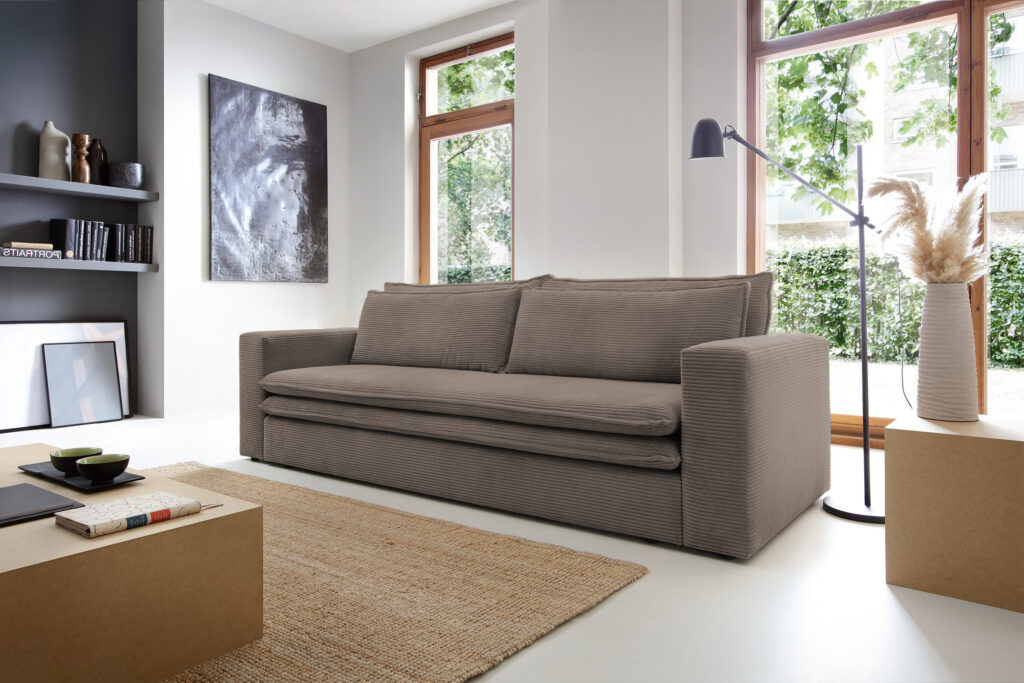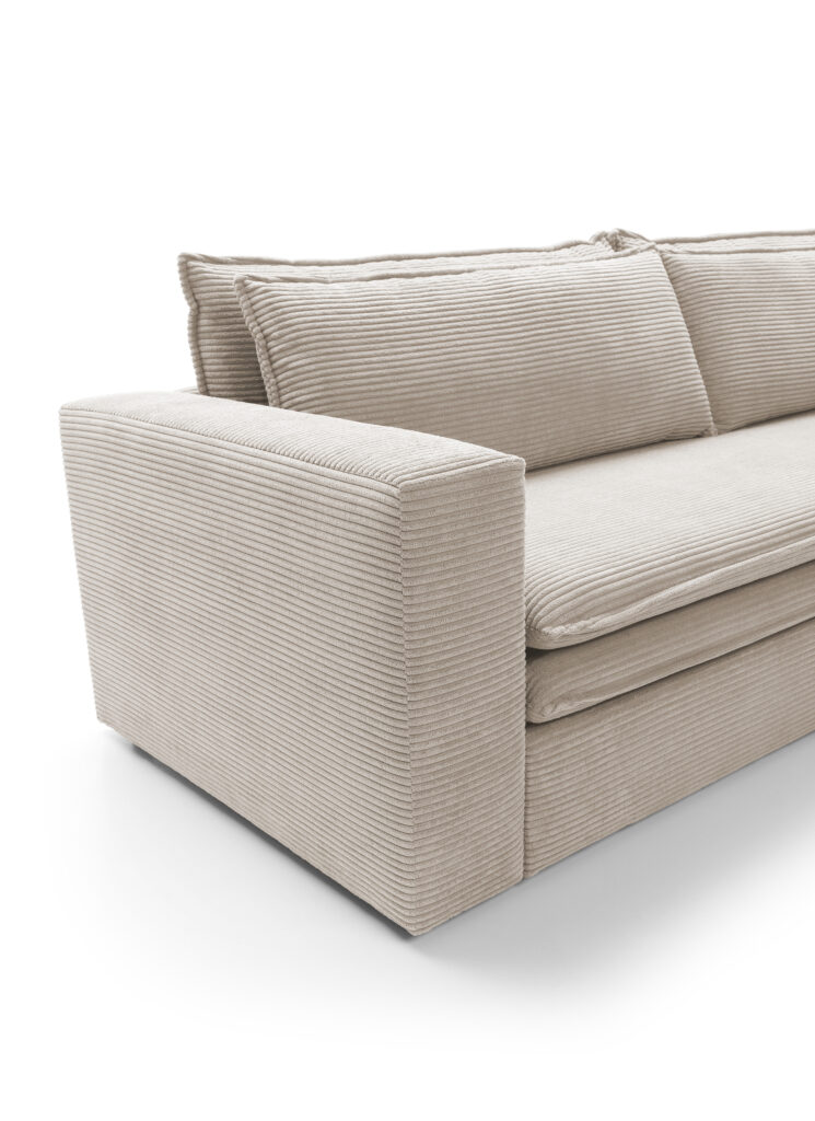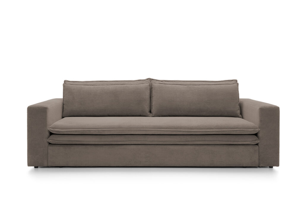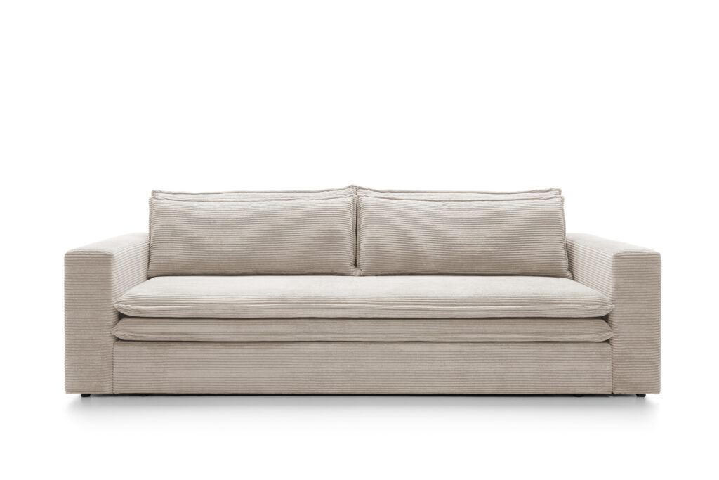 Super wygodna, nowoczesna sofa Tilia, z funkcją spania oraz pojemnikiem na pościel.Sofa wykonana jest w miękkiej sztruksowej tkaninie Poso.