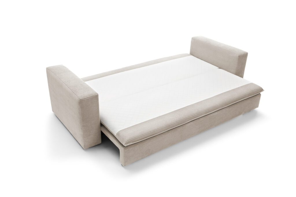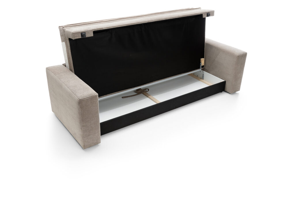 Mebel posiada funkcję do spania i pojemnik na pościel. Cechy te sprawdzą się idealnie podczas wizyt gości oraz osób szukających dodatkowego miejsca do wypoczynku.