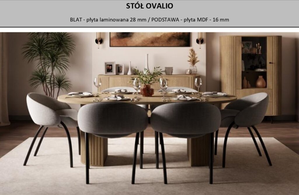 Kolekcja Ovalio to minimalistyczna forma,urozmaicona starannymi frezami,która wprowadza do wnętrza zupełnie nowy wymiar elegancji.Kolorystyka została utrzymana w stonowanych barwach ziemi,takich jak Beż Piaskowy oraz Dąb Cremona.Kolekcja została wzbogacona o akcenty w czerni i złocie,które przełamują jasne tonacje.