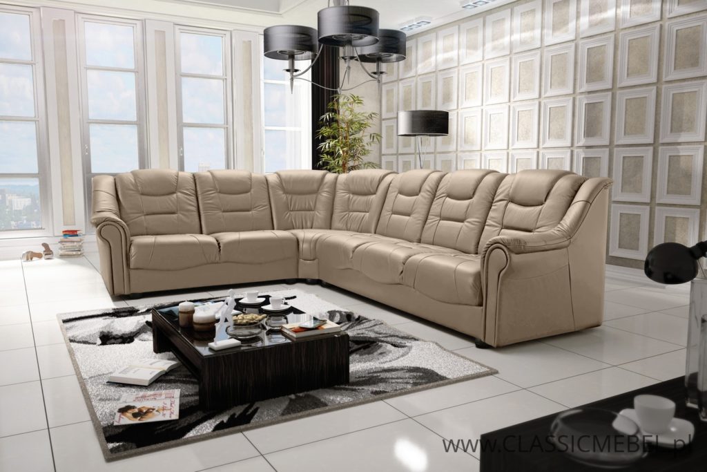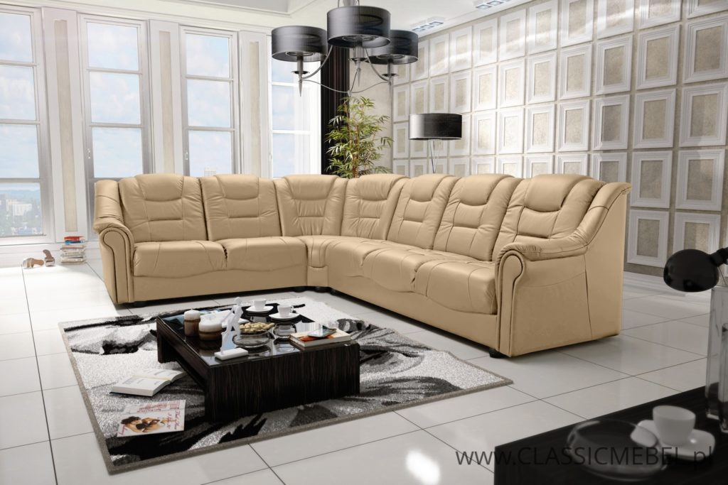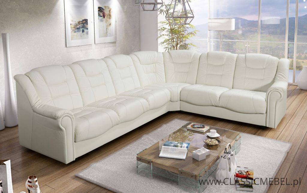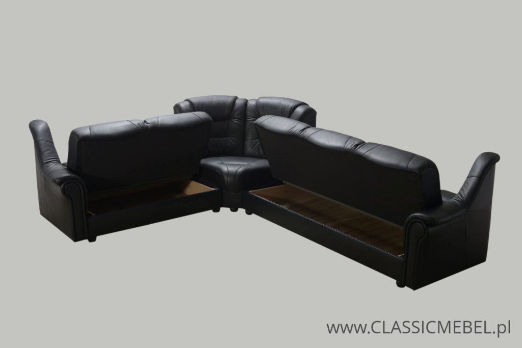 Wykonanie zewnętrzne, to w 100% skóra naturalna plus drewno dębowe przy czym tył narożnika obity jest wigofilem.