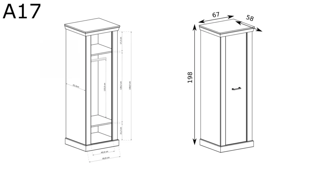 ✅ Praktyczny układ: Prosta, jednodrzwiowa szafa – Wąska i wysoka konstrukcja, idealna do zagospodarowania niewielkich przestrzeni