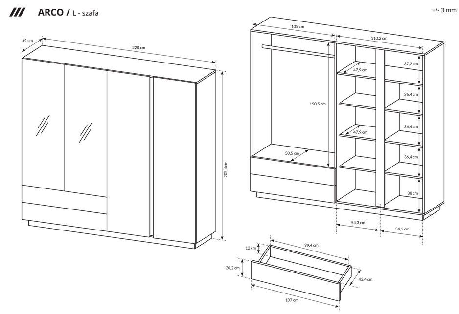 szafa – szerokość 220 cm / wysokość 202,4 cm / głębokość 54 cm