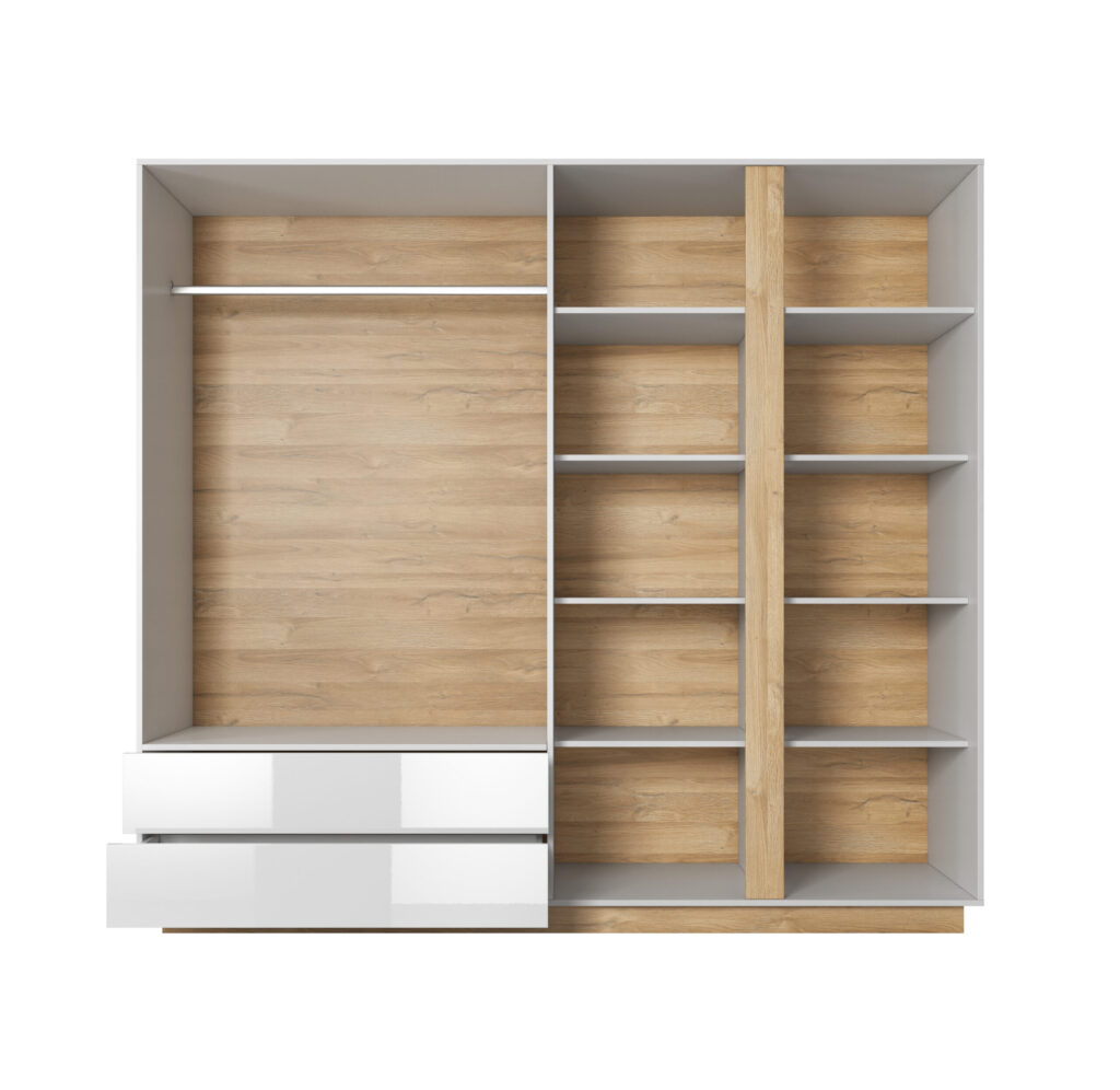 Szafa Arco 220 cm z lustrami – Biały / Biały Połysk / Dąb Grandson – Laski