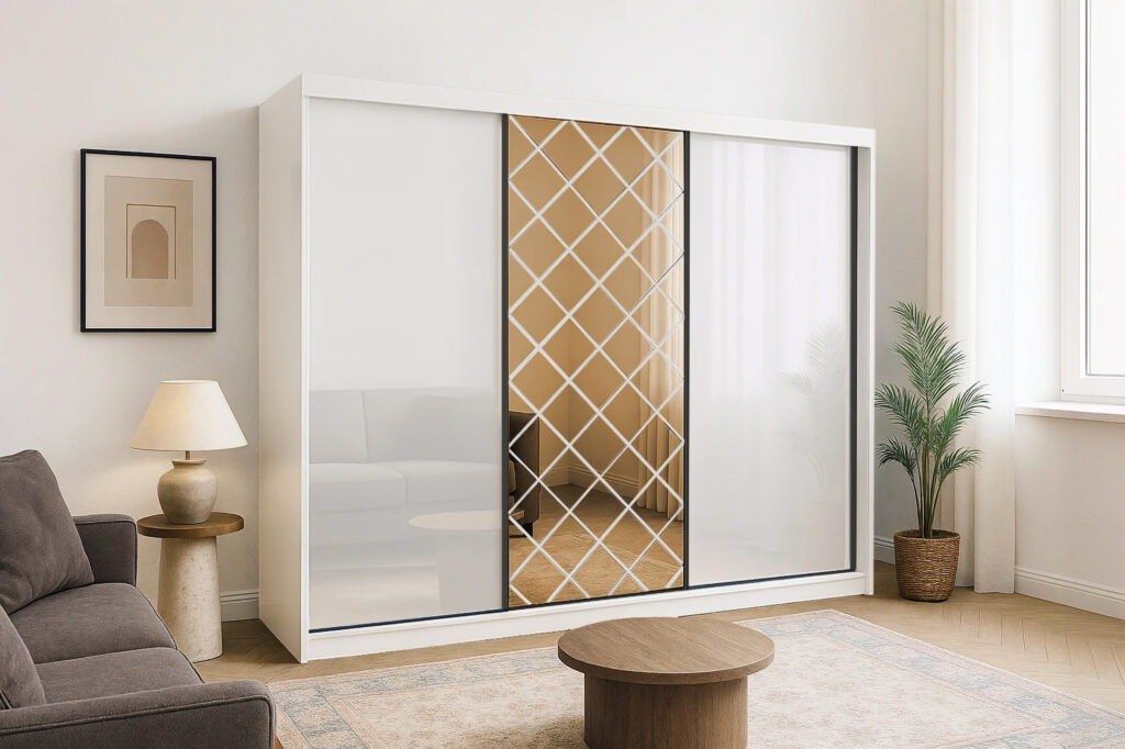 Szafa CARO 250 to elegancja i wyrazisty akcent we wnętrzu. Jej nowoczesny design dopełnia miedziane lustro z efektem szlifowanego rombu, które nadaje całości luksusowy wygląd. Połyskujące wykończenie dodaje głębi i stylu, idealnie pasując do wnętrz w stylu glamour, loftowym czy nowoczesnym. Przesuwne drzwi zapewniają wygodę użytkowania nawet w mniejszych pomieszczeniach. Solidne wykonanie gwarantuje trwałość i estetykę przez lata.