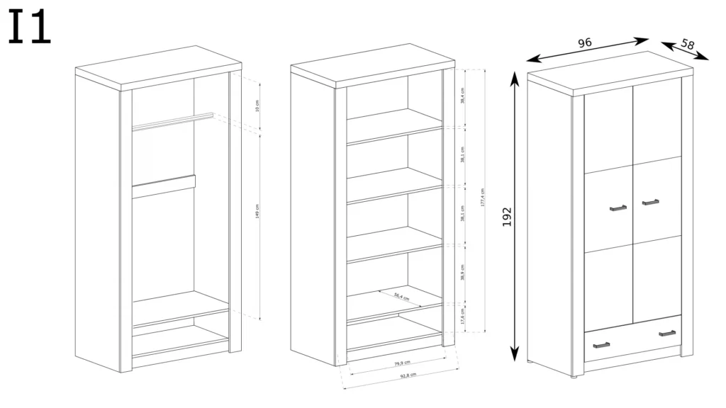 Prosta, duża szafa dwudrzwiowa z metalowymi uchwytami. W jej skład wchodzi szuflada głęboka na 58 cm. W szafie jest również drążek o długości 92 cm doskonały, aby zagospodarować dostępną przestrzeń, powiesić ubrania, być zorganizowanym. Z pewnością ta szafa zapełni puste miejsce w naszym domu, stworzy się z nią wiele ciekawych aranżacji oraz zaskoczy gości swoim oryginalnym krojem. Dostępna w trzech wybarwieniach.