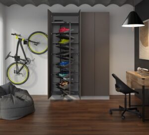 SB 80 2/235,7 cm – słupek o szerokości 80 cm i wysokości 235,7 cm z półką oraz ośmiopoziomowy regał obrotowy na buty w kolorze czarnym
