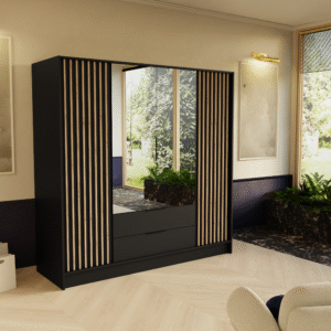 Przedmiotem oferty jest szafa Nero w wymiarze 200 cm w kolorze czarnym z lustrami i z lamelami w kolorze wotan . Mebel nadaje się do każdego wnętrza – sypialni, garderoby, pokoju dziecięcego czy też pokoju dziennego.