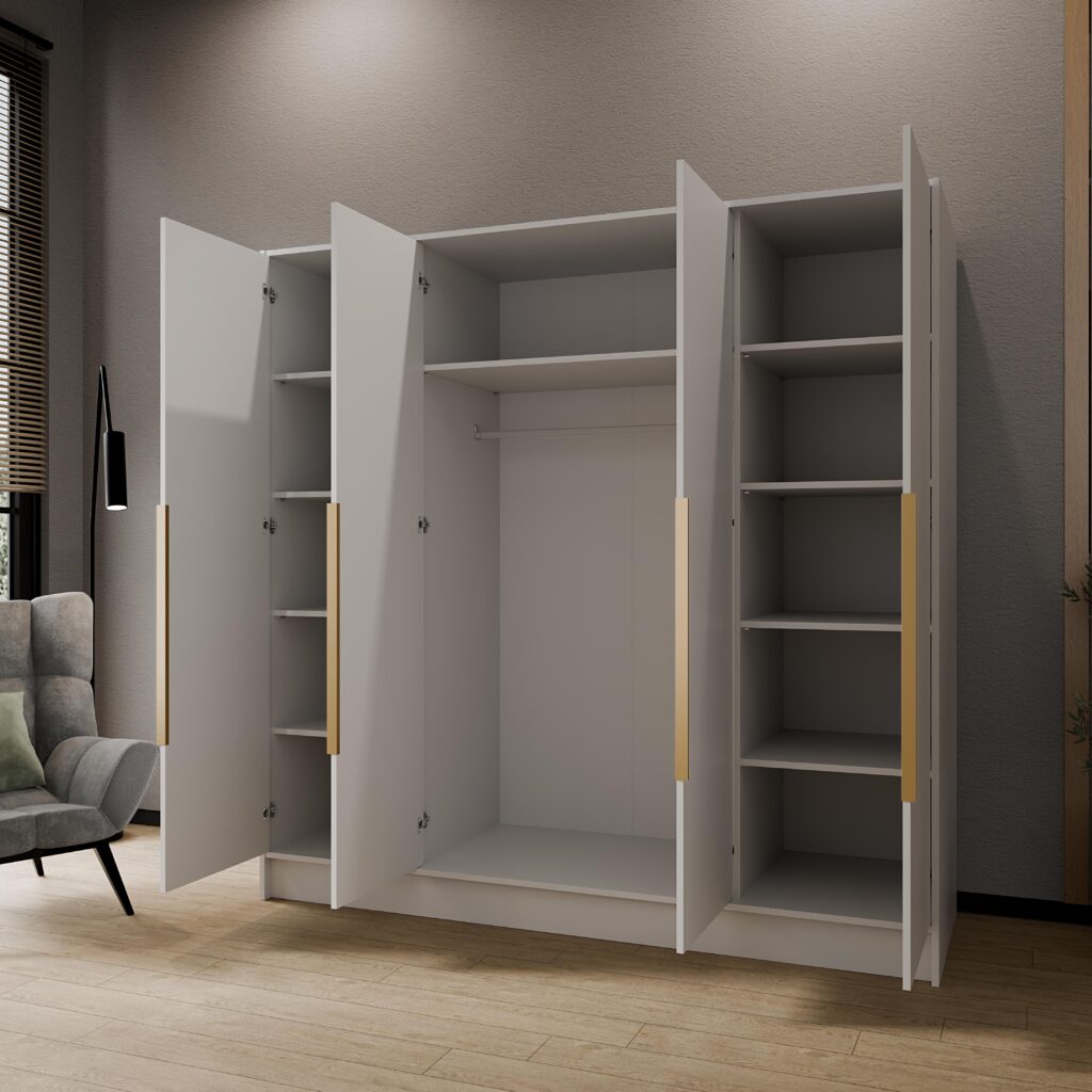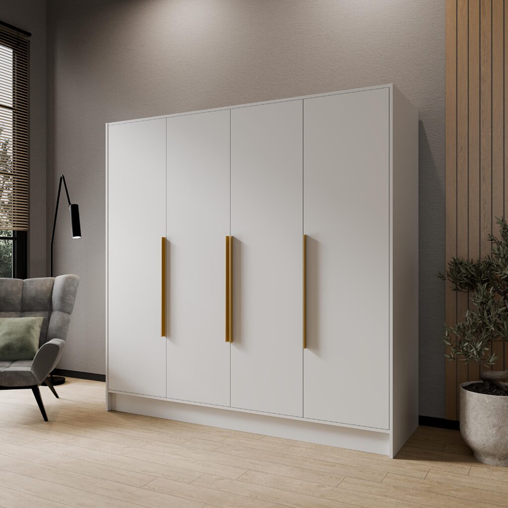 Szafa czterodrzwiowa Porto 200 cm w kolorze białym z uchwytami złotymi