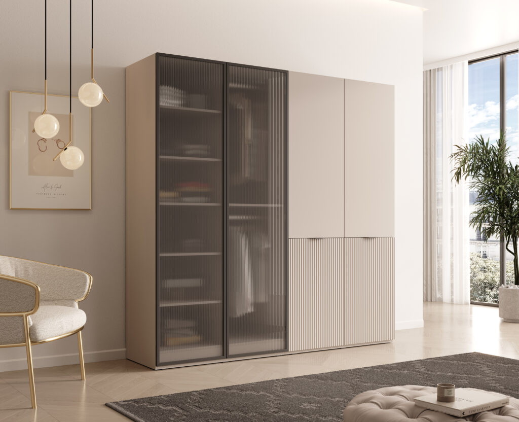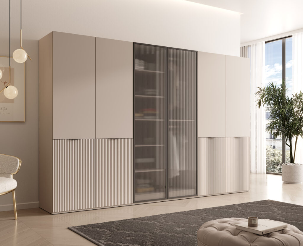Szafa Sandbox Nova posiada 2 fronty. W jednej części są dwa drążki a w drugiej części są półki.