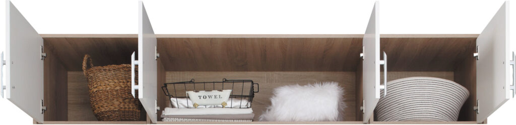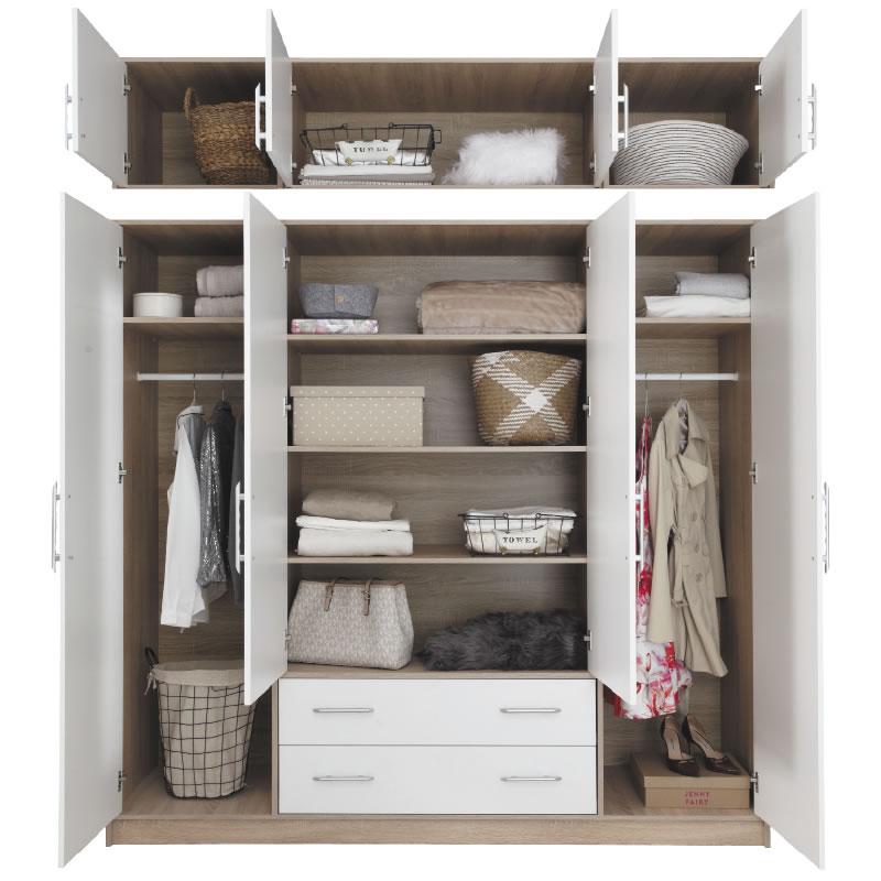 Funkcjonalny układ wewnętrznych modułów z podziałem na półki, drążki oraz szuflady.