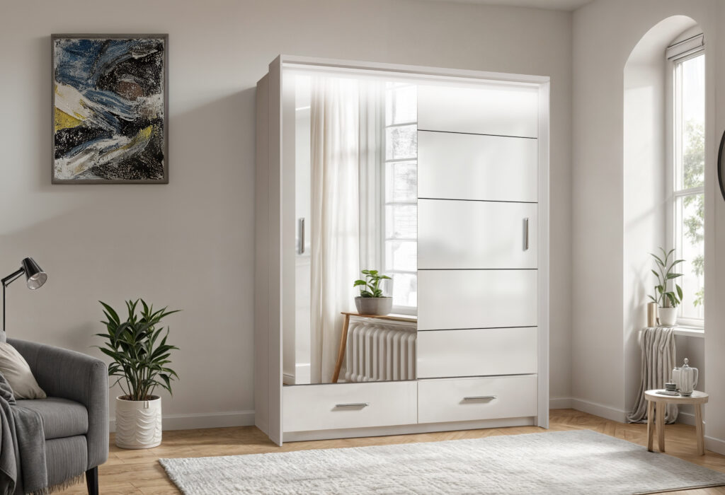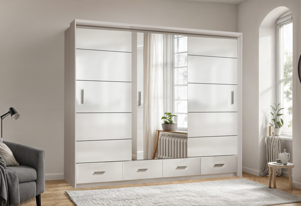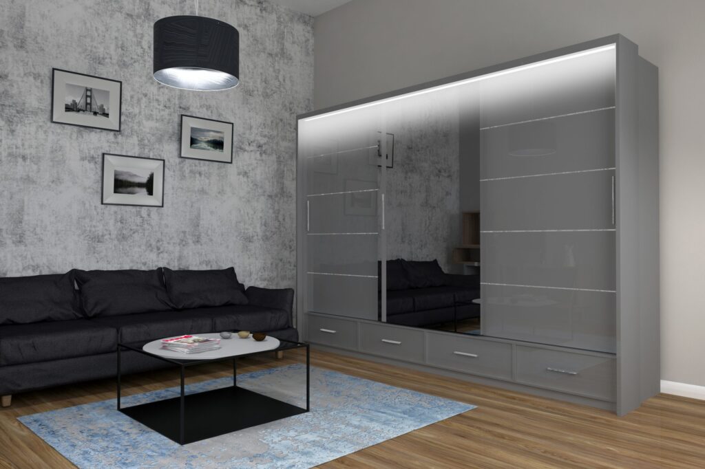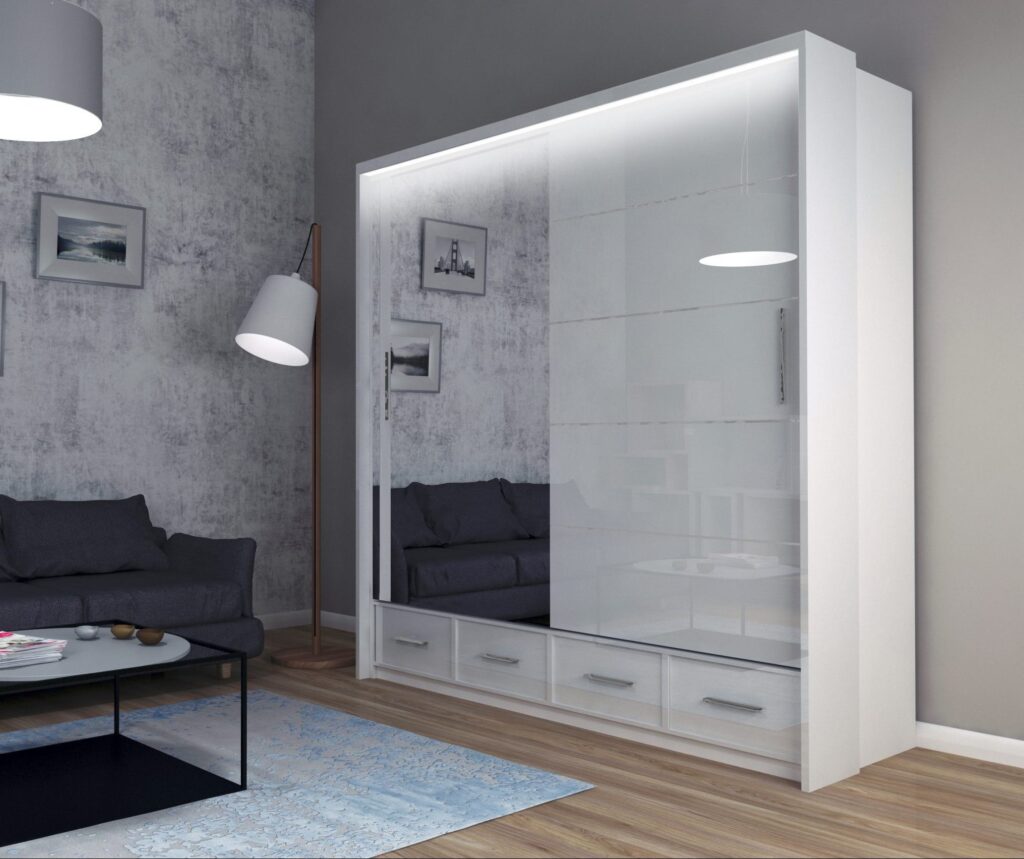 Szafa Sycylia 250 cm LED – Biały Połysk / Lustro – Arkos