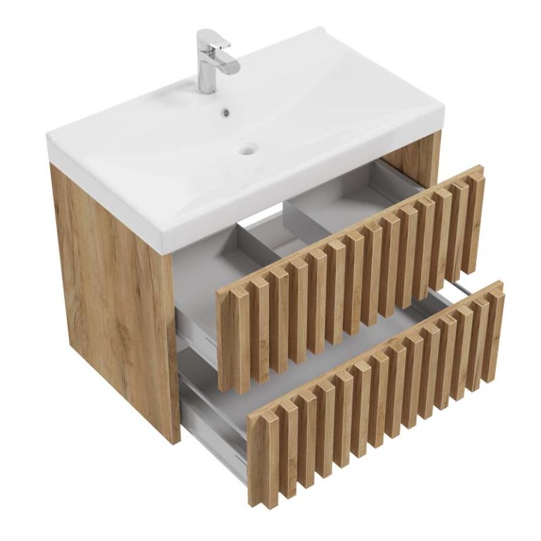 Elegancka i designerska szafka podumywalkowa DELANO idealnie odnajdzie się w nowoczesnych łazienkach. Szafkę w całości zaprojektowano w dekorze o barwie dębu złotego, który wprowadza do łazienki akcent ciepła i przytulności. Najbardziej charakterystyczną cechą mebla jest front wykonany z lameli. Ten oryginalny akcent buduje cały styl szafki i sprawia, że żadne dodatkowe ozdobniki nie są już potrzebne. Dlatego też mebel nie posiada uchwytów, ani innych zbędnych detali.