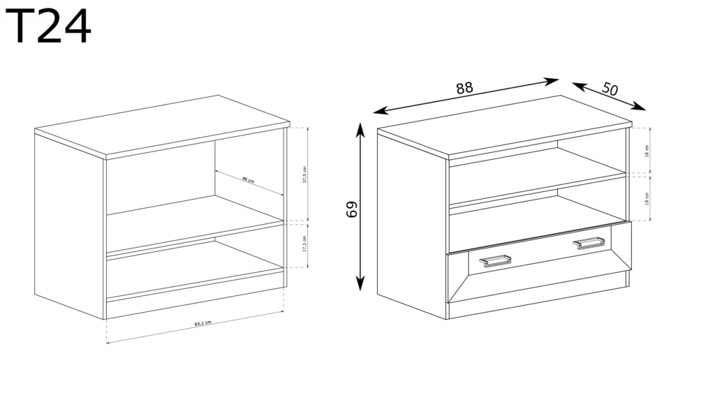 ✅ Przechowywanie – Półki: Dwie otwarte półki na dekoder lub konsolę.