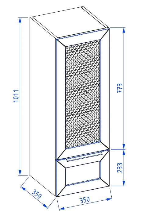 Front – lakierowana płyta meblowa 16mm z frontem z perforowanej stali w kolorze szafki oraz metalową złotą siatką w tle. Możliwość montażu jako prawy lub lewy.