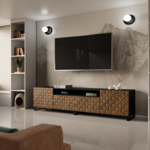 Przedmiotem oferty jest szafka RTV Cali 200 stojąca w kolorze czarny / catania. Mebel nadaje się do każdego wnętrza – sypialni, salonu, biura, pokoju dziecięcego czy też pokoju dziennego.