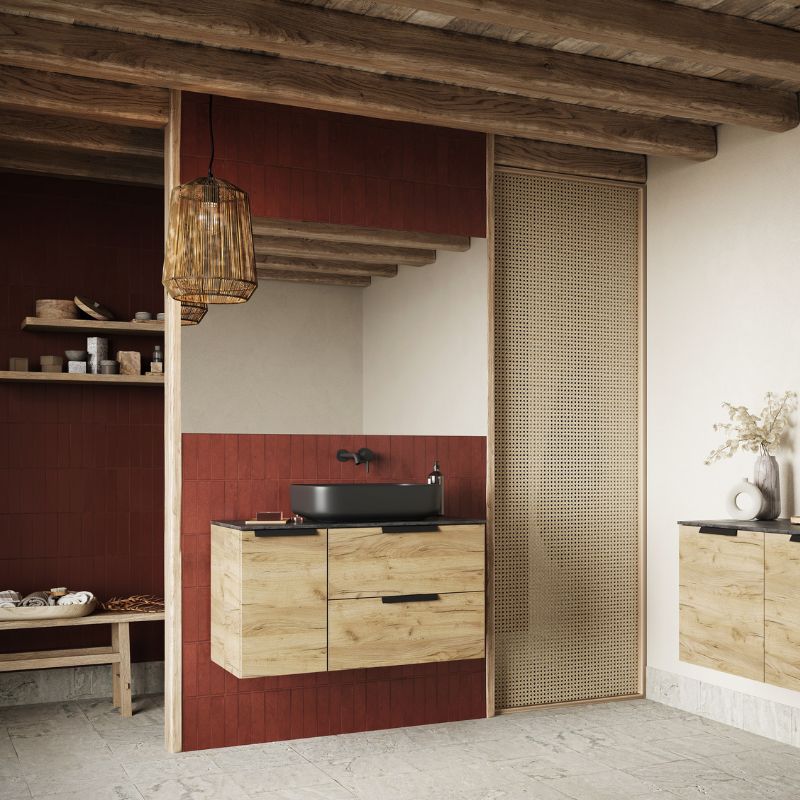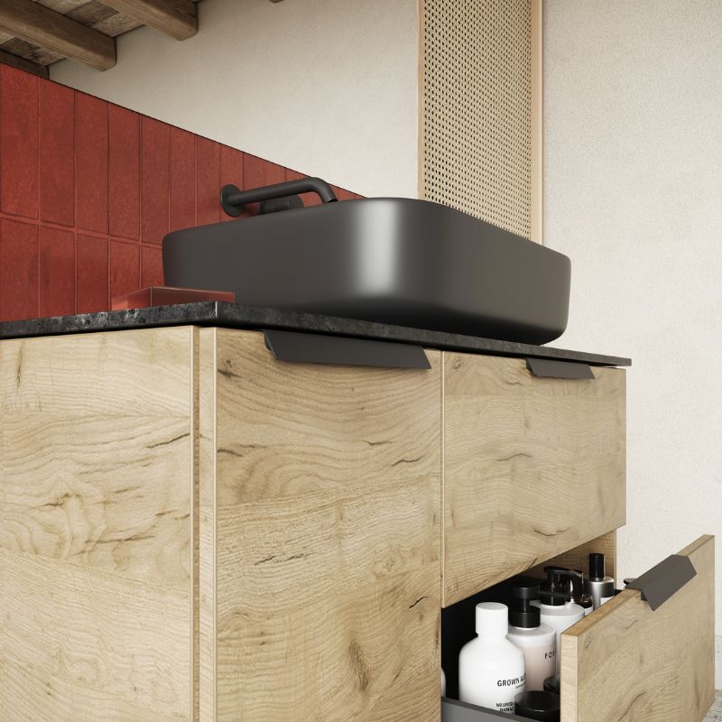 Aby stworzyć udaną aranżację połącz umywalkę Teramo z szafką i blatem konglomeratowym lub laminowanym. Jeśli wybierzesz dłuższy blat, możesz wykorzystać go do ustawienia potrzebnych kosmetyków, a nawet dekoracji.