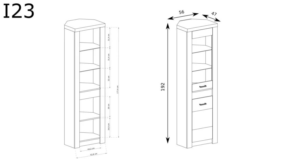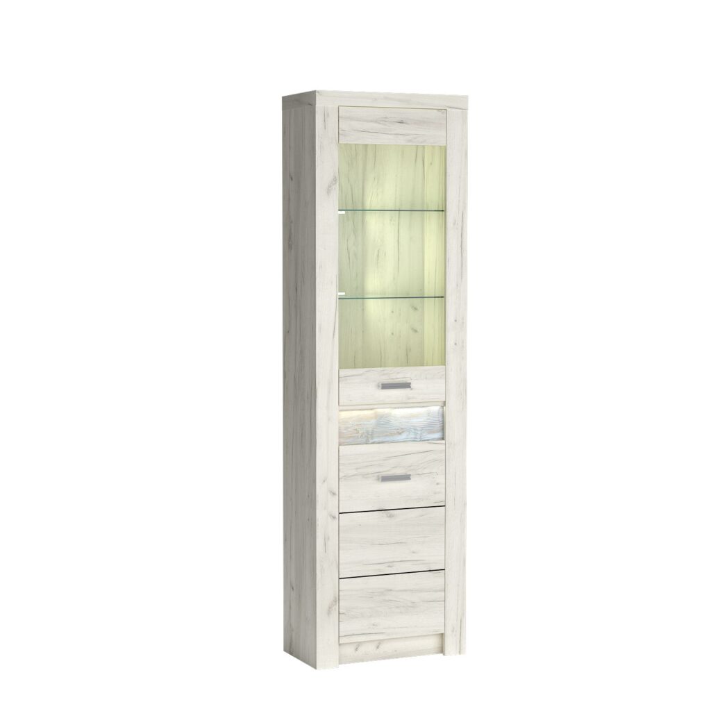 Witryna narożna z kolekcji Indianapolis, która zmieści się w każdy kąt. Posiada dwie półki za szklanym frontem, które są idealne do eksponowania wielu ozdób, książek czy zestawu porcelany. Trzecia półka znajduję się za szafką z pełnym frontem, dzieli ona przestrzeń na pół, przez co możesz wykorzystać miejsce w meblu w 100%. Metalowe uchwyty idealnie współgrają z całością. Możliwość wymienienia frontu szklanego na pełny.