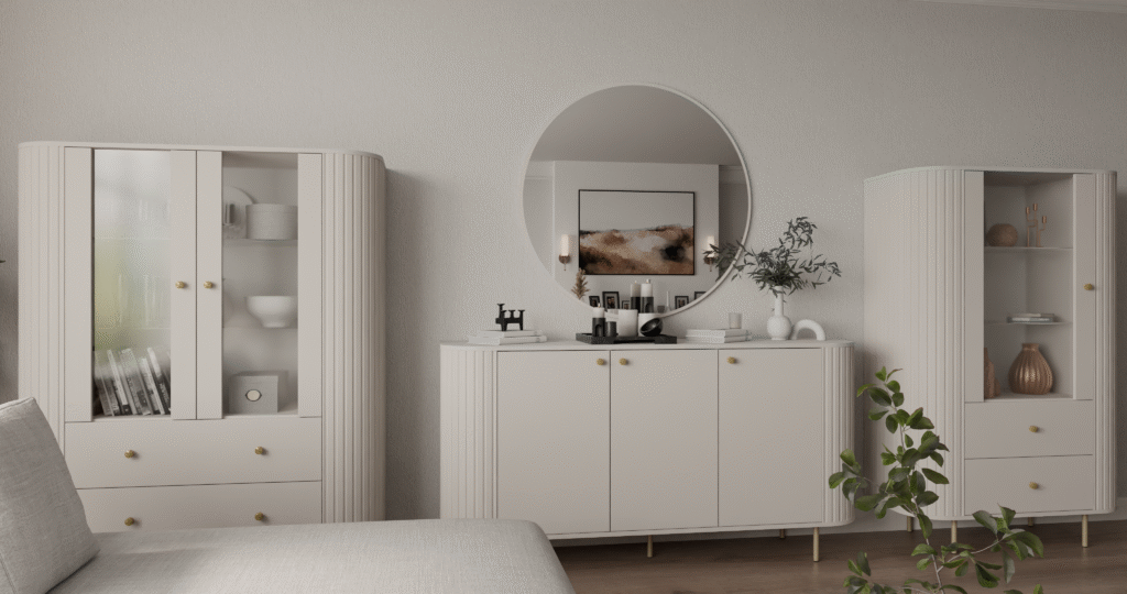 Kolekcja została zaprojektowana tak,aby każdy element – od witryn i komód, po ławy i szafki RTV – mógł być wykorzystany indywidualnie, a jednocześnie tworzyć spójną i harmonijną całość.