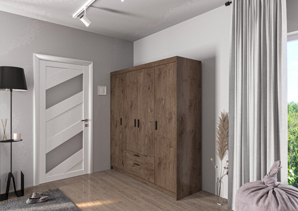 Ciekawa, a zarazem klasyczna kolorystyka wkomponuje się w styl Twojego mieszkania. Pojemna garderoba wyposażona w półki i drążki co znacznie ułatwi przechowywanie ubrań. Wykonana ze starannością z wysokiej jakości materiałów daje gwarancję użytkowania przez długie lata. Szafa czterodrzwiowa, wykonana z płyty wiórowo laminowanej 15 mm, oklejona obrzeżem PCV.