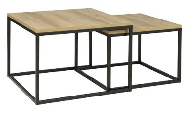 Cena dotyczy zestawu dwóch stolików kawowych kwadratowych w kolorze dąb riviera ze stelażem czarnym widocznych na zdjęciu poniżej.